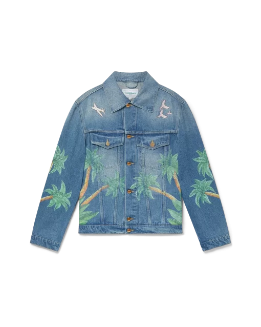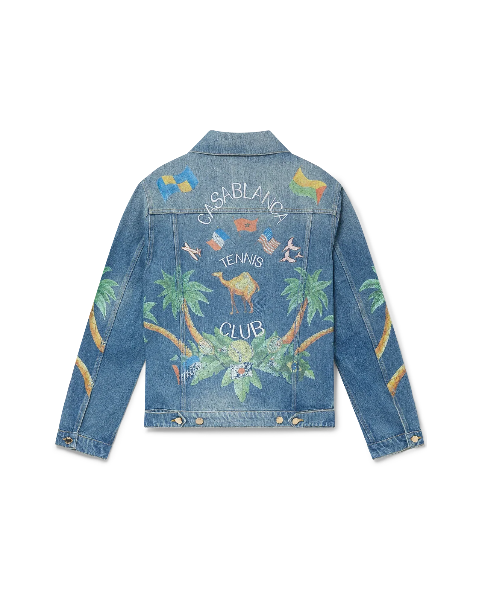 The motif denim jacket is a classic silhouette crafted from cotton fabric with a classic fit. Finished with the season’s embroidered and printed artwork with intentional fading representing the house’s symbology with nature and tennis, chest pockets and gold-plated hardware closure. Intended to be worn with its coordinating straight-leg motif jeans.