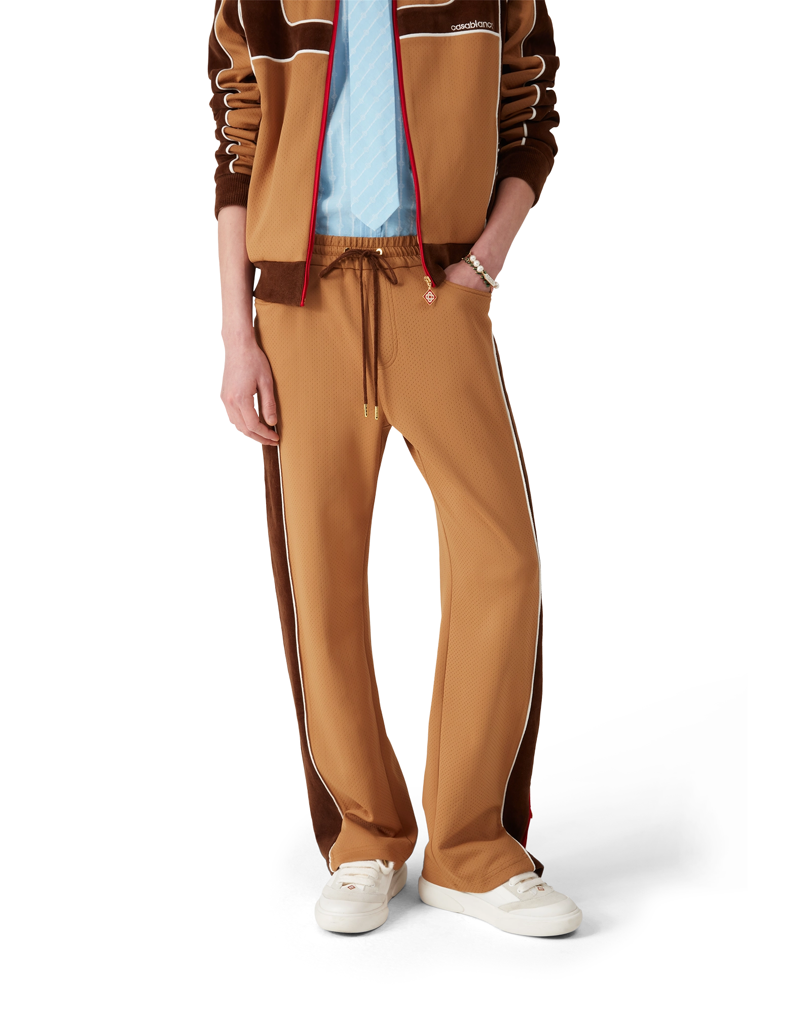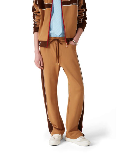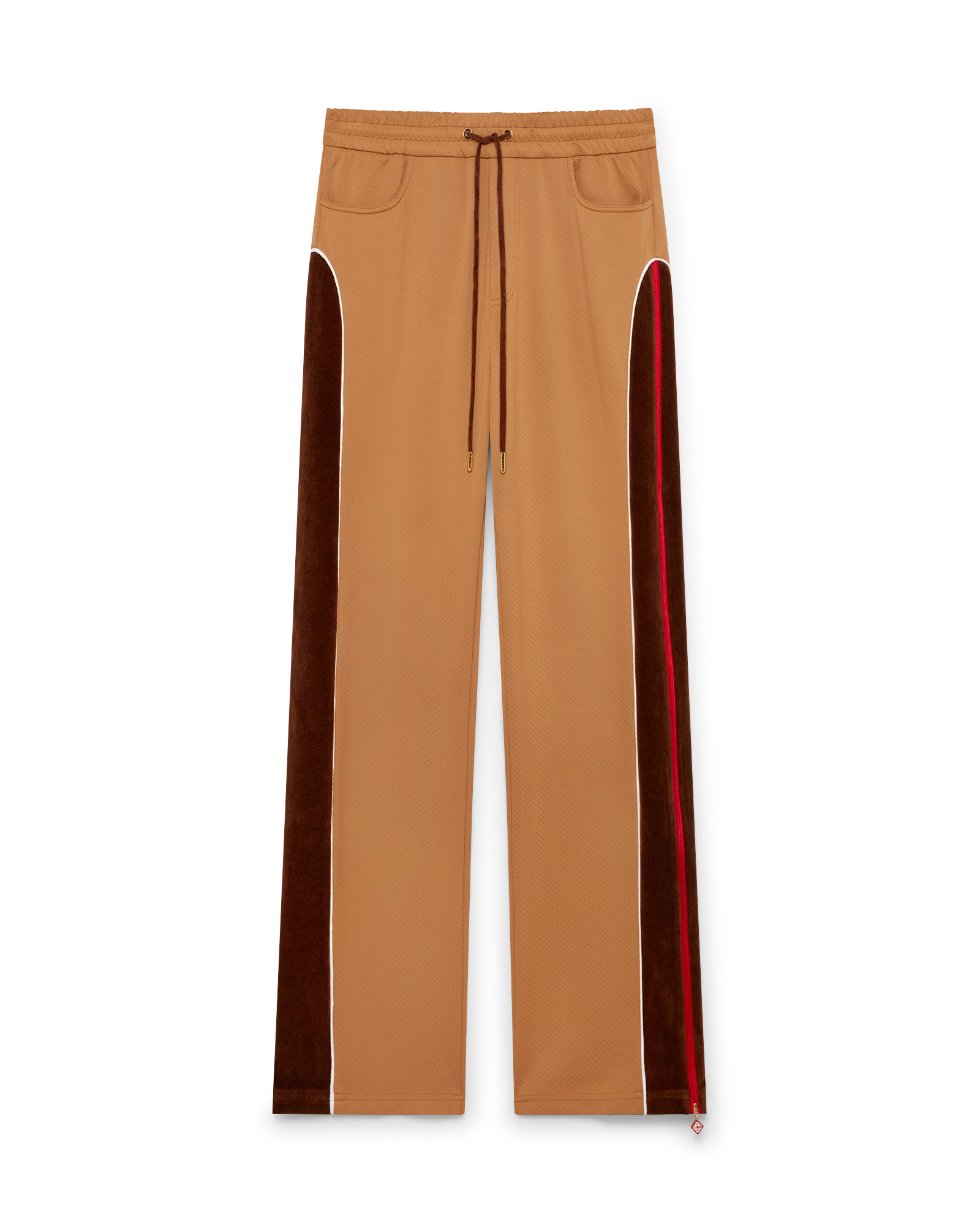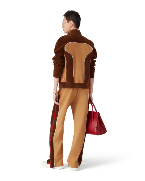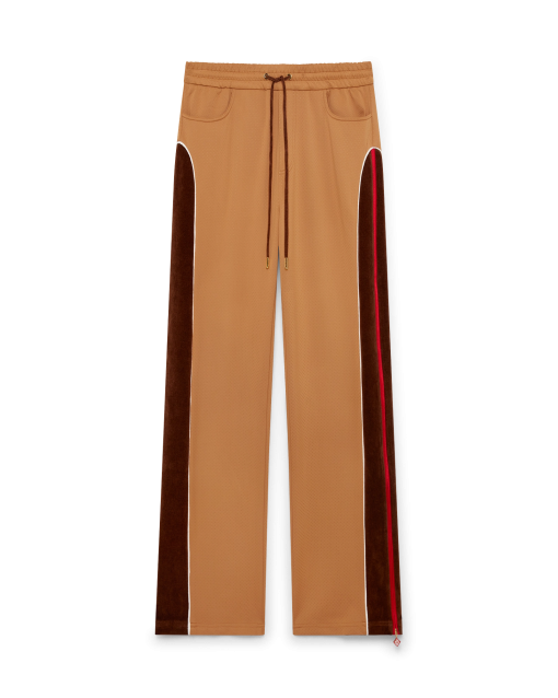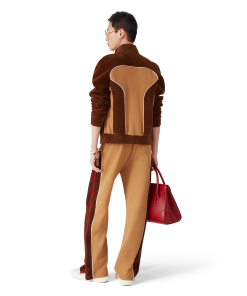 The Chenille panelled track pant is a sportswear-inspired design crafted from velour technical fabric and features the house’s signature diamond logo on the zipper tab. Completed with an elasticated waistband, gold-tipped drawstring fastening, side panels with white piping details, front pockets, and a welt back pocket with zip closure. Designed to be worn with its matching Chenille panelled track jacket.