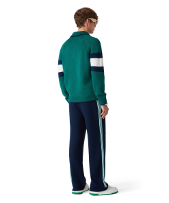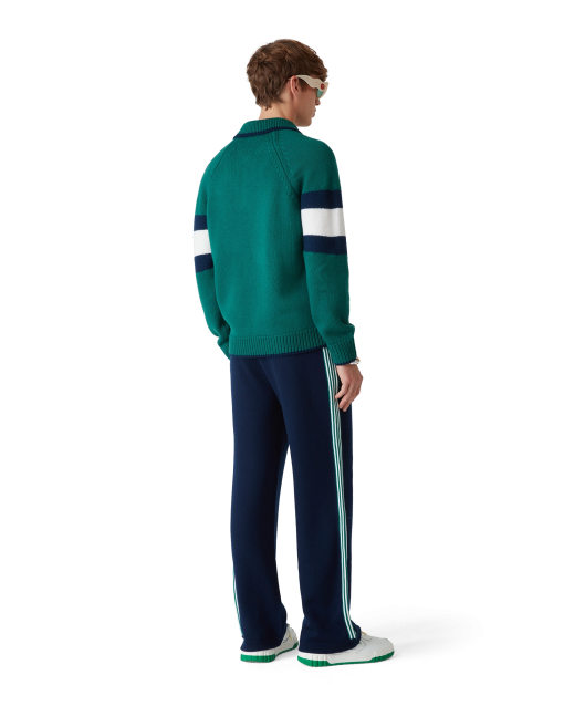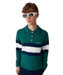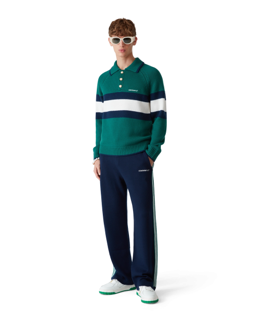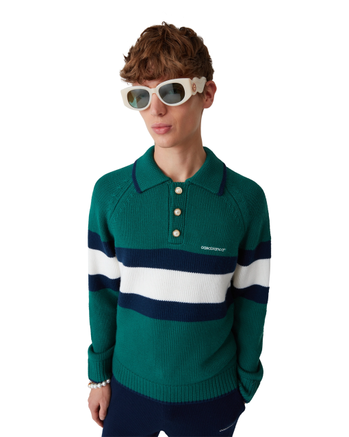 The colourblock polo shirt is a long-sleeve design crafted from merino wool fabric and features a blue and white stripe across the chest and back. Completed with raglan sleeves, ribbed cuffs, hem and collar, signature gold-rim pearl buttons and Casablanca logo.