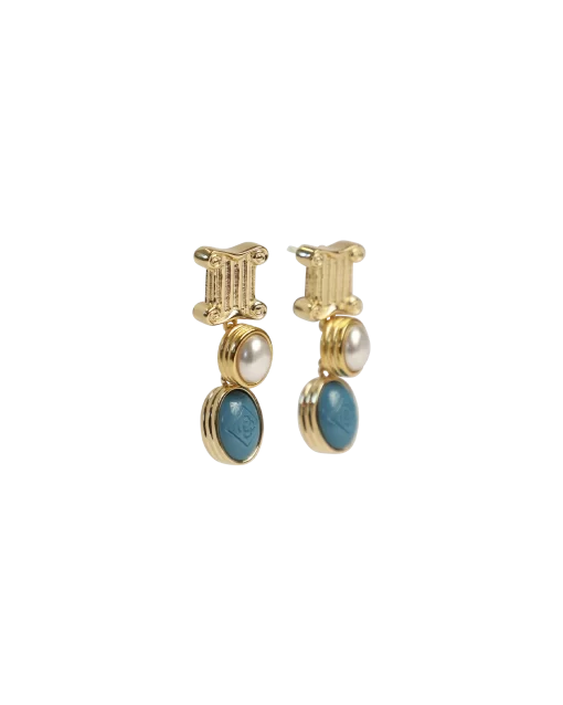 The column drop earrings encapsulate motifs of ancient Greece and the house’s signature crest engraved in resin. The Greek columns are crafted in gold-plated brass. Designed for pierced ears.