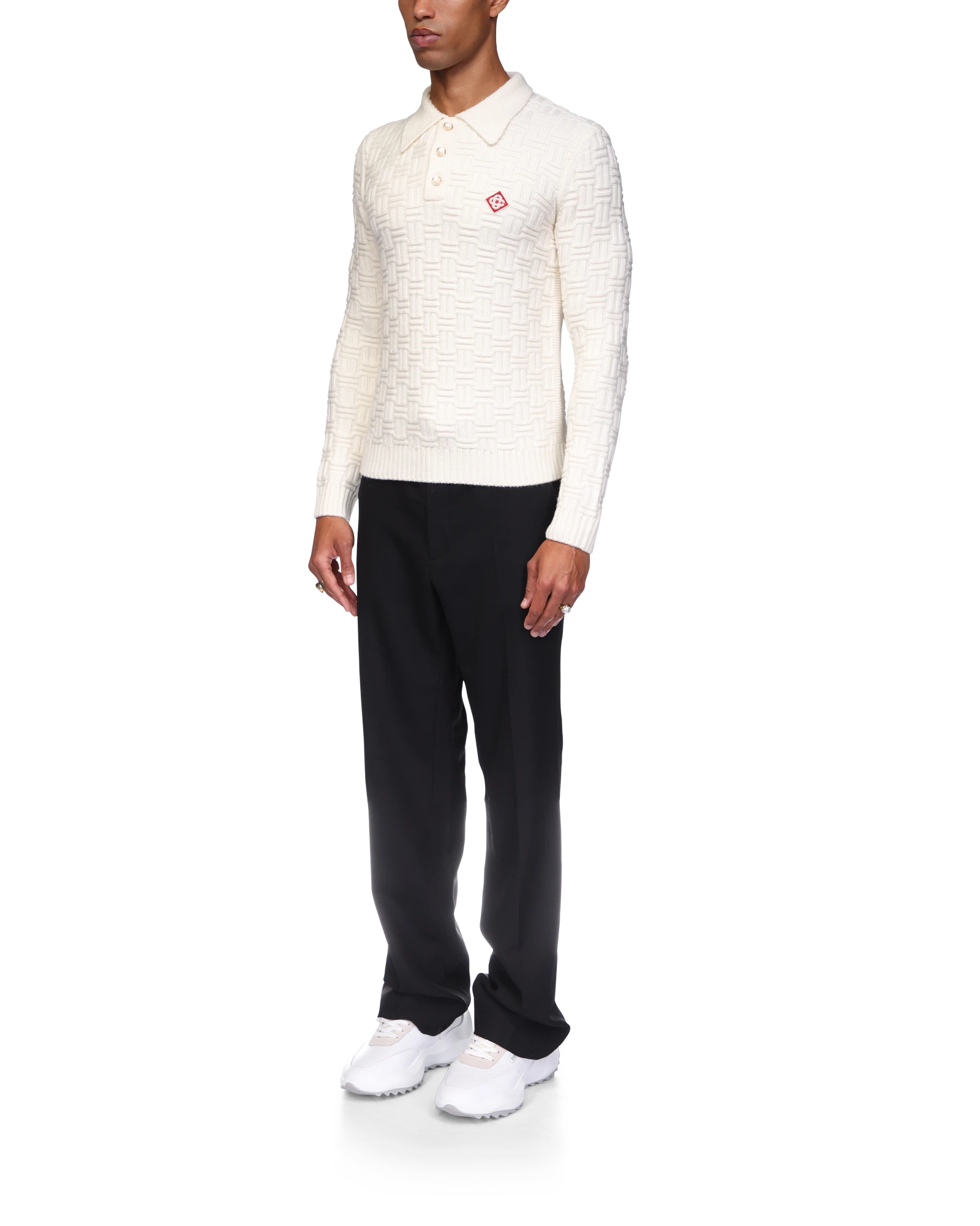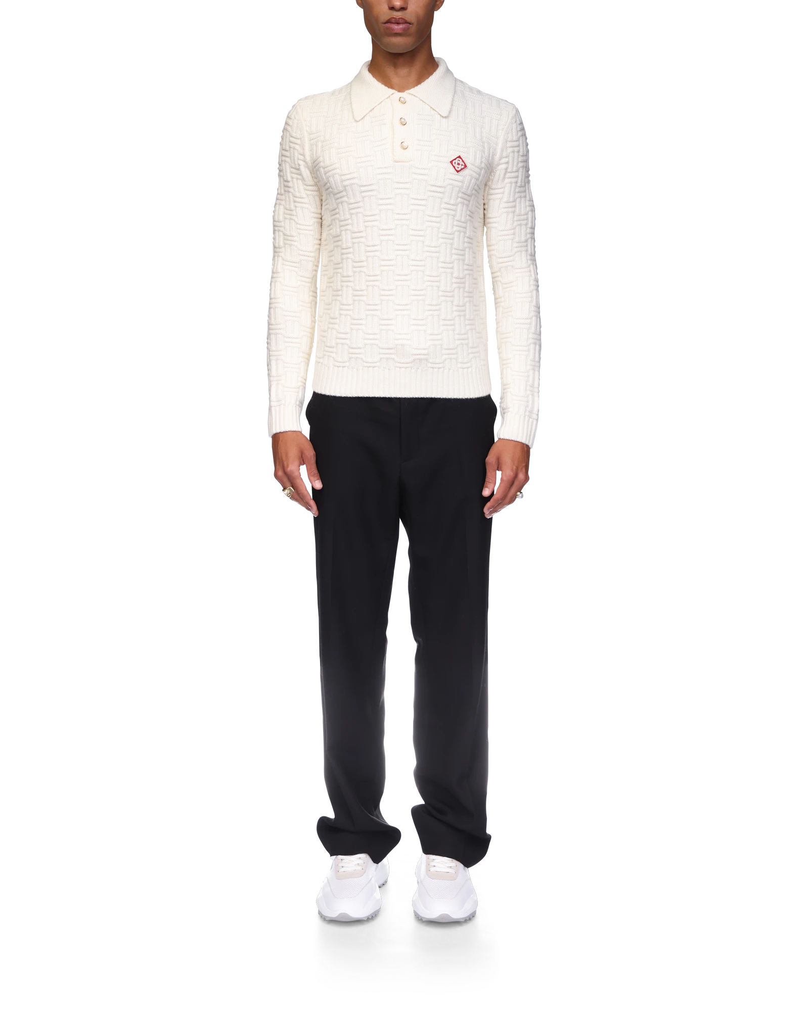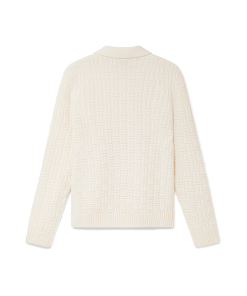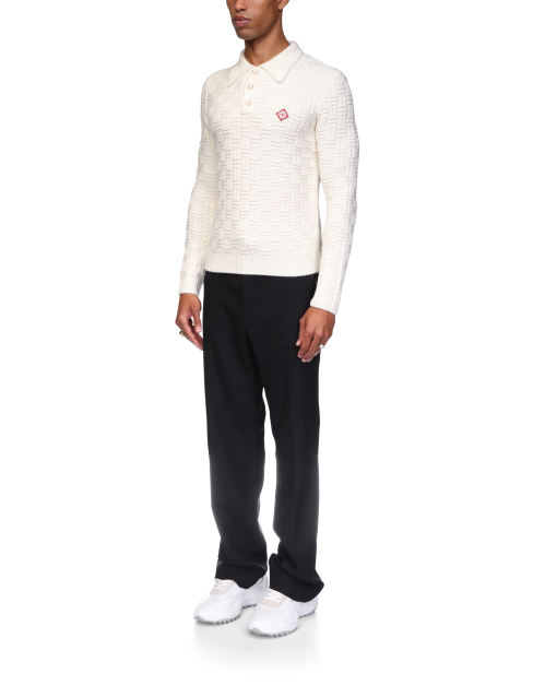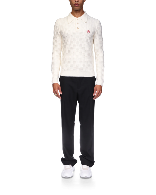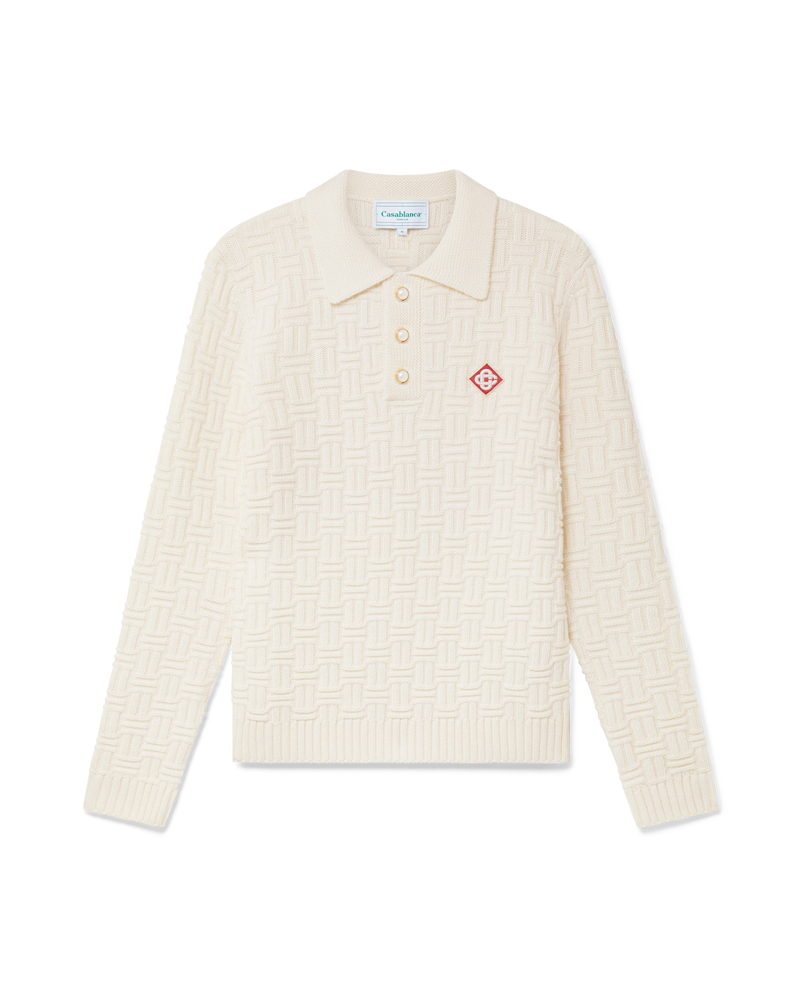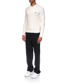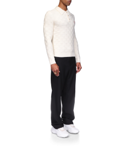 The column knit polo is a long-sleeved woven design crafted from a soft luxurious merino wool. Completed with the house’s diamond logo, signature gold rim pearl buttons, a collar, and rib cuffs and hem detail.