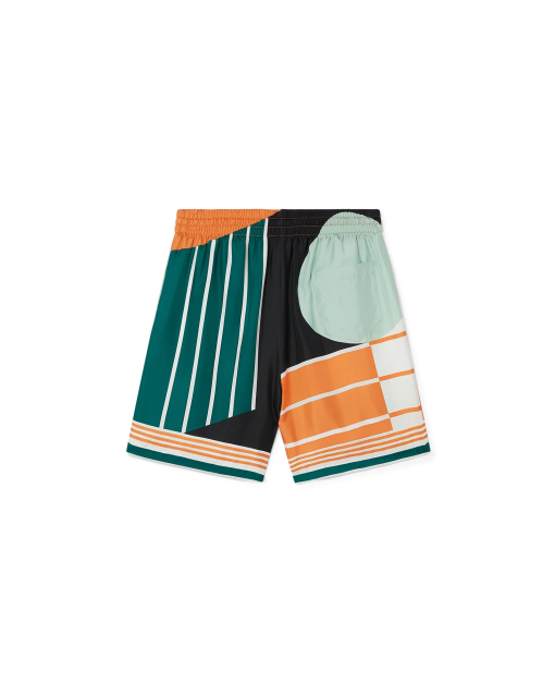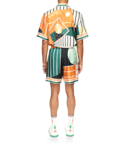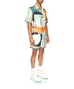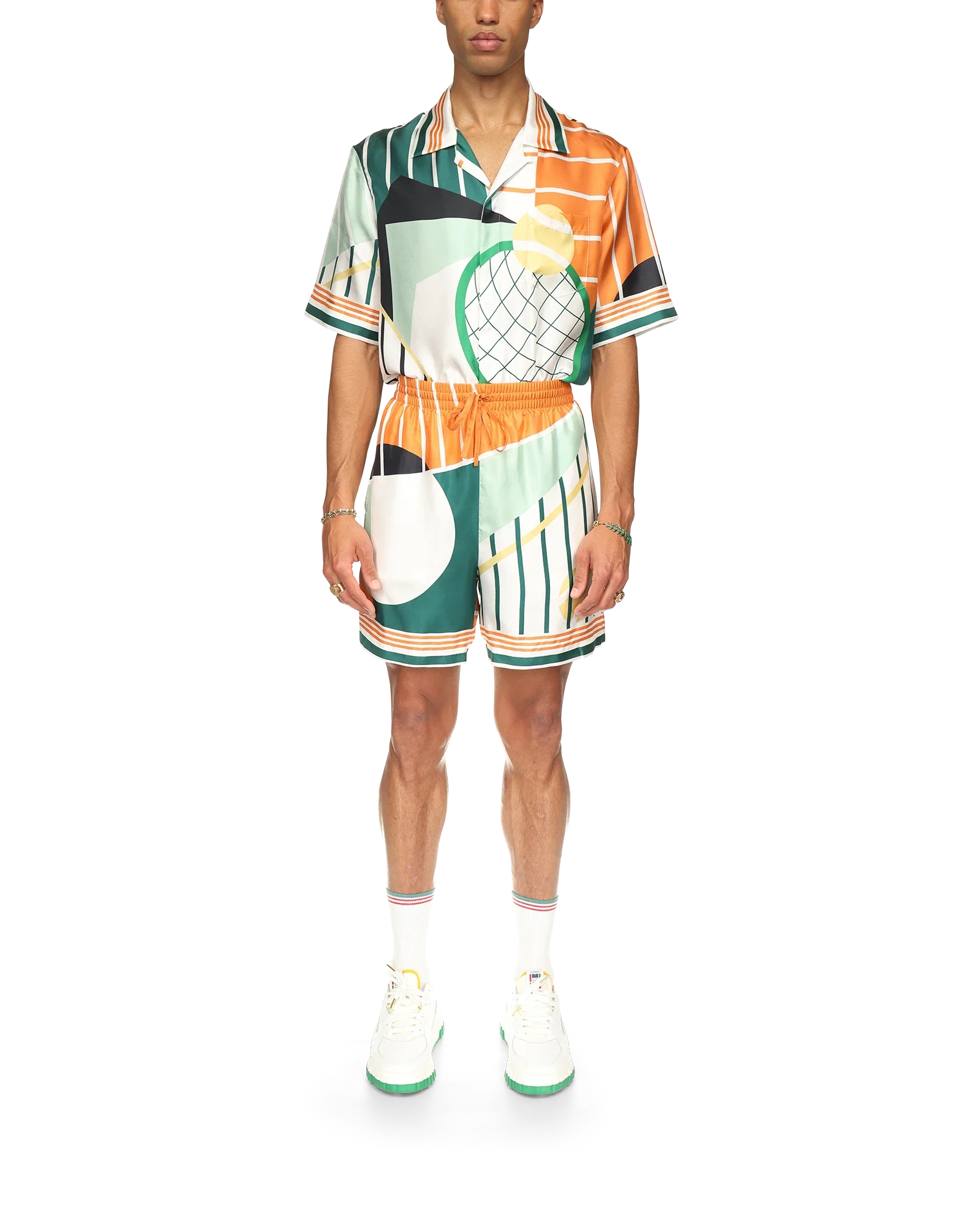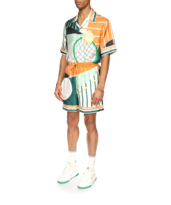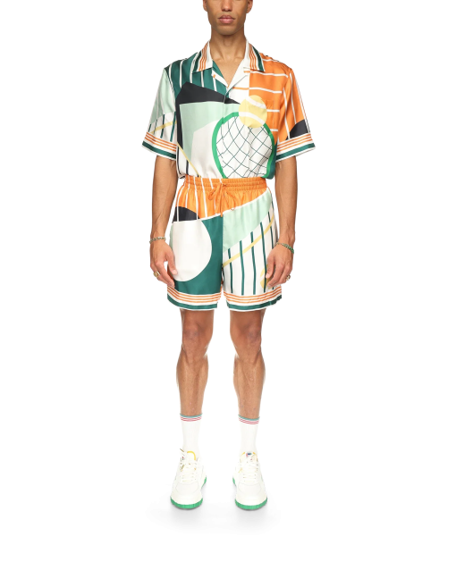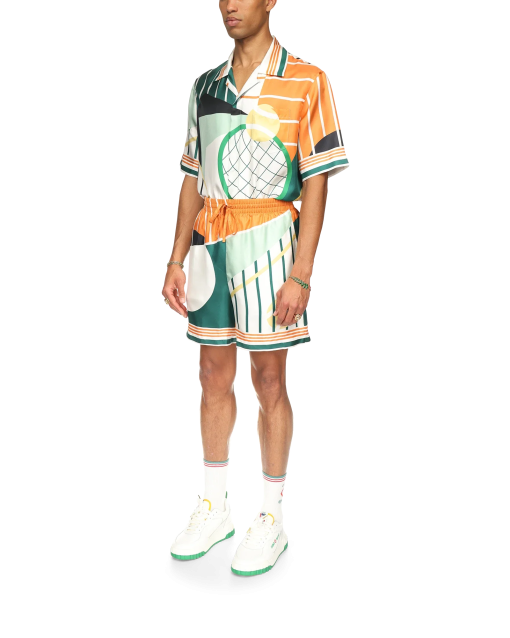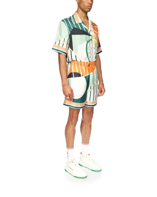 The Court Abstrait silk short is an all-over print design featuring the house’s classic iconography artwork of tennis equipment. Finished with stripe detailing on the hem, back pocket, in-seam pockets, drawstring fastening and Casablanca branded label – designed for a classic Fits.