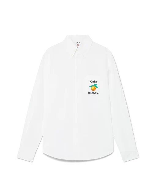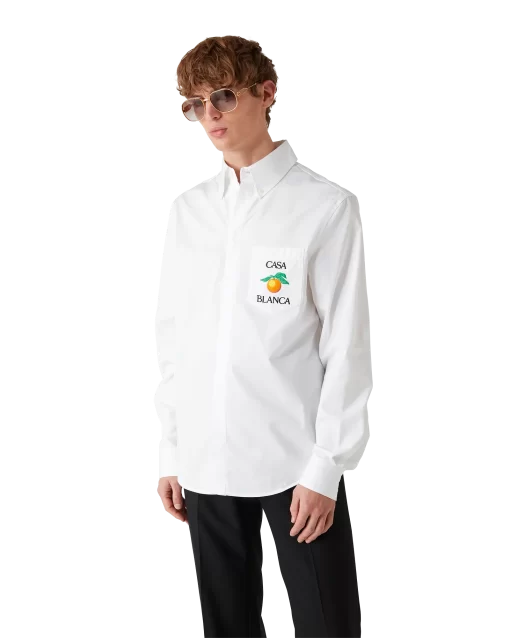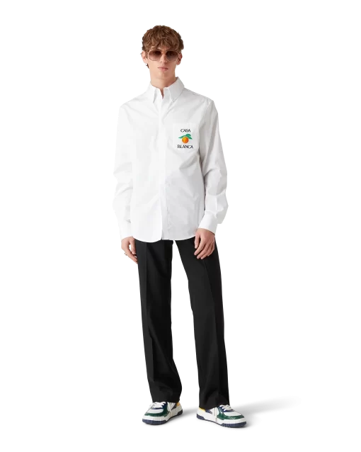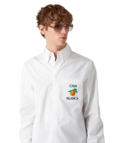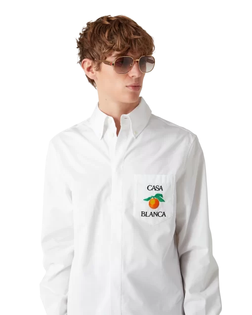 The embroidered orange oxford shirt is a long-sleeve design, crafted from cotton fabric and features an embroidered orange – one of the house’s design elements – and Casablanca text. Completed with a breast pocket, a buttoned-down pointed collar, hidden front button closure, and interlocking CC logo corozo buttons.
