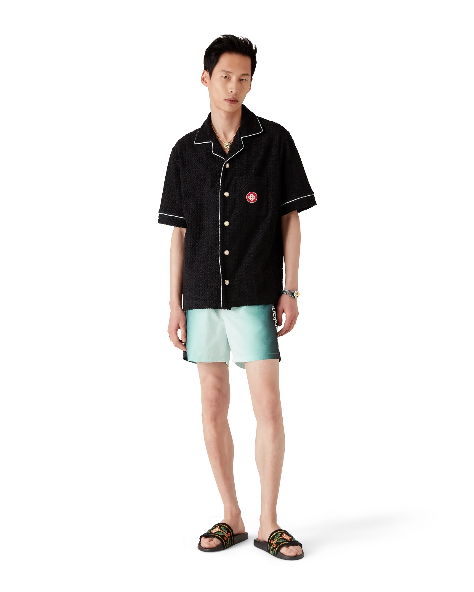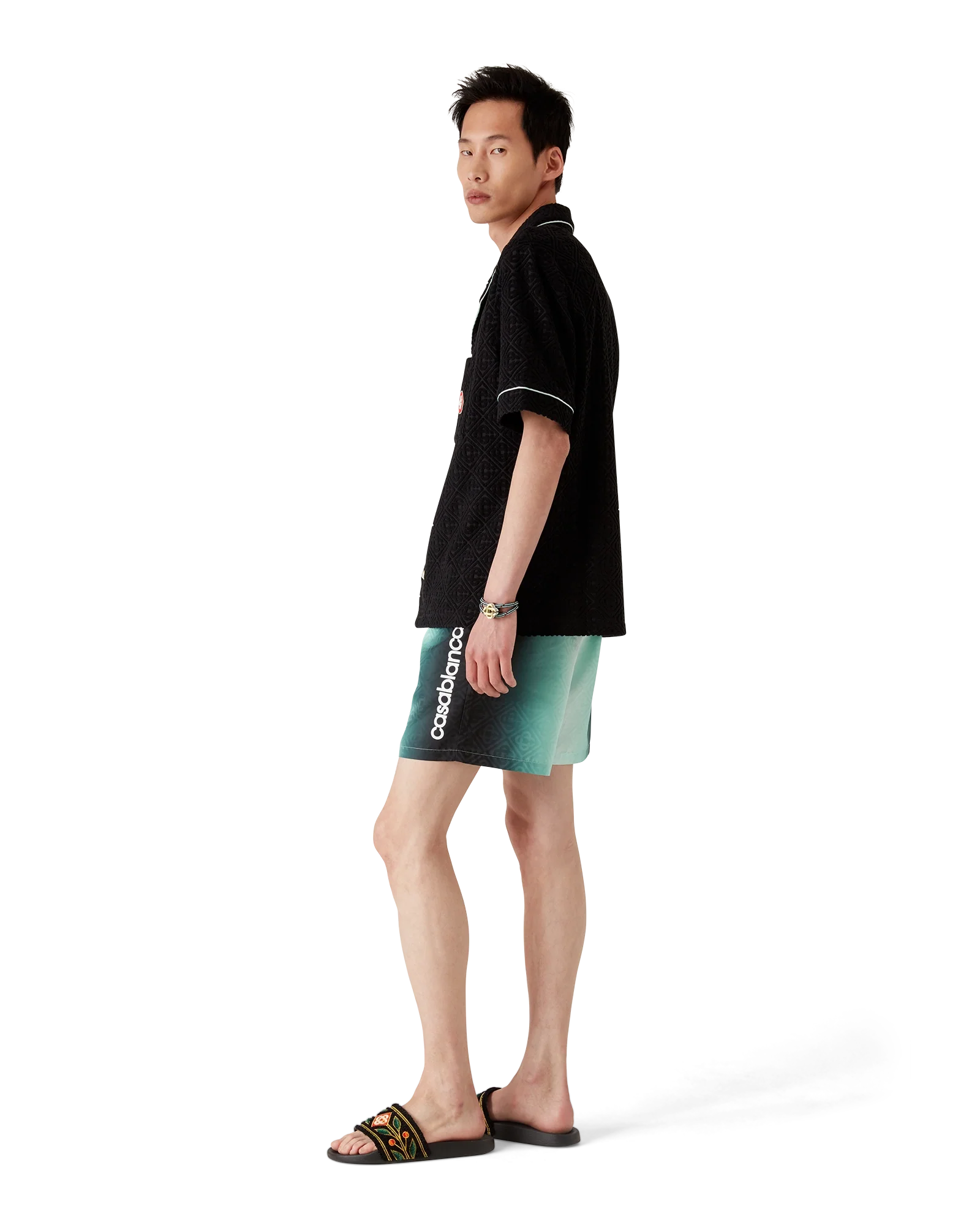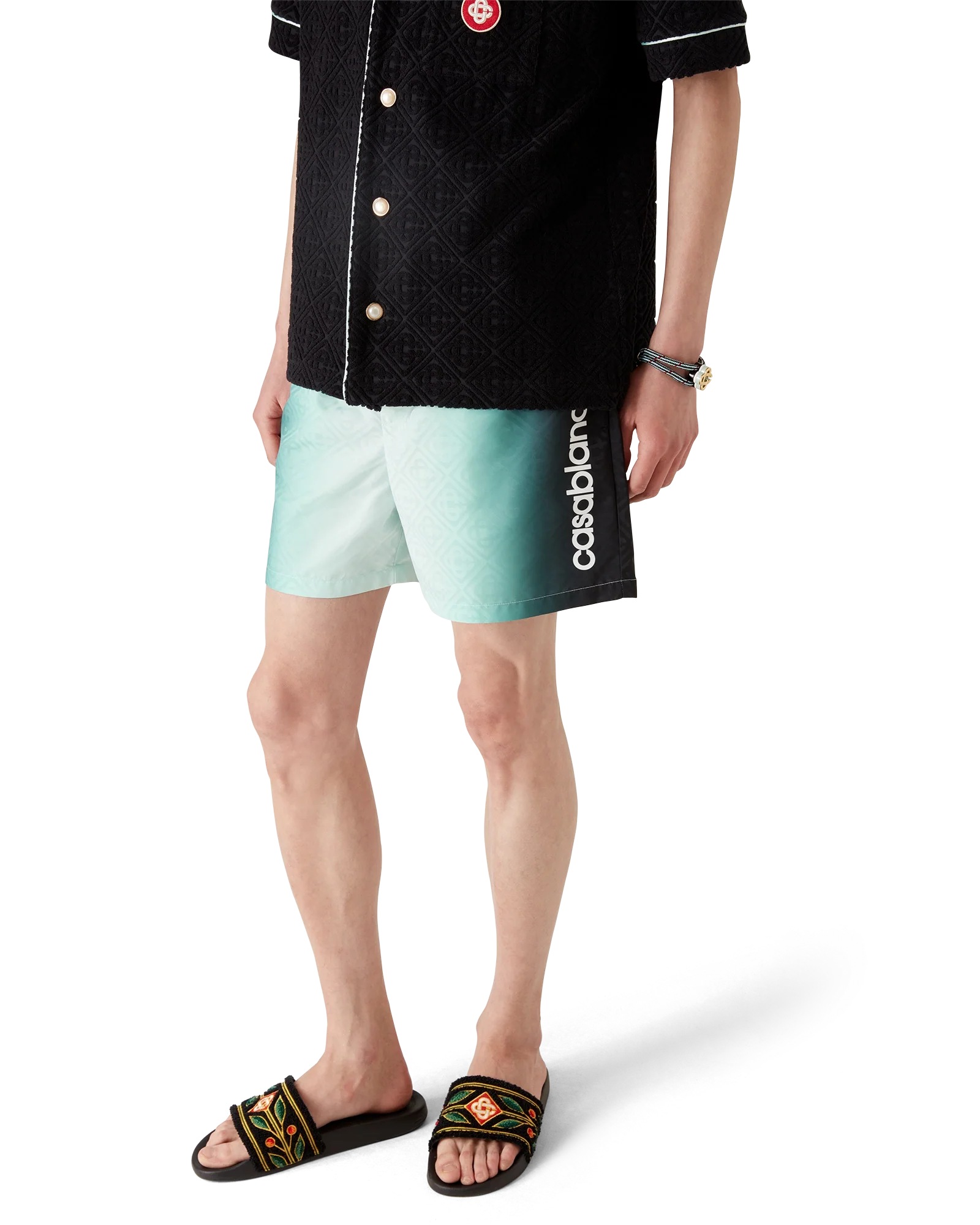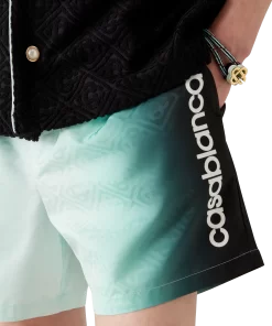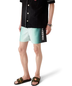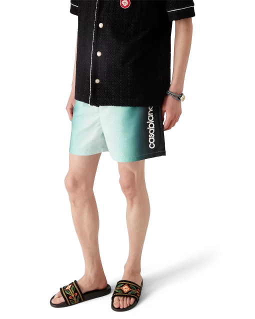 The gradient jacquard swim shorts are a classic swimwear design crafted from a gradient technical swim fabric, featuring the house’s signature Casablanca logo down the side. Completed with an elasticated waistband, internal drawstring fastening, a lining, an internal pocket, and in-seam side pockets.
