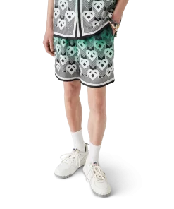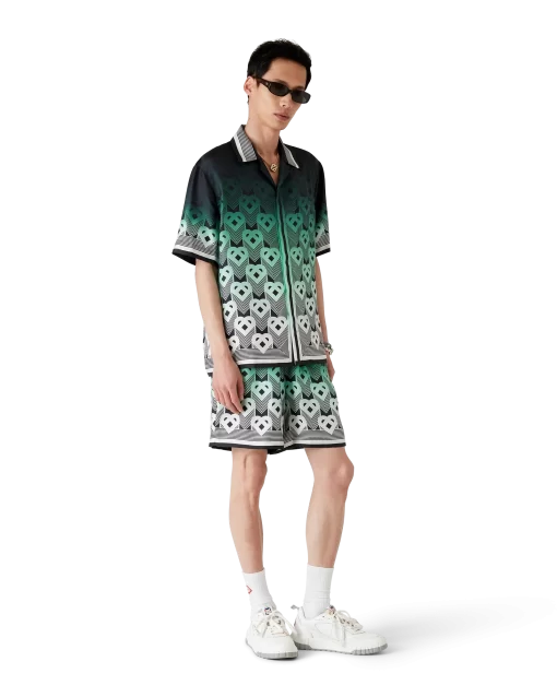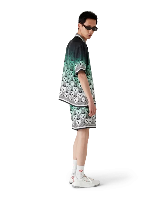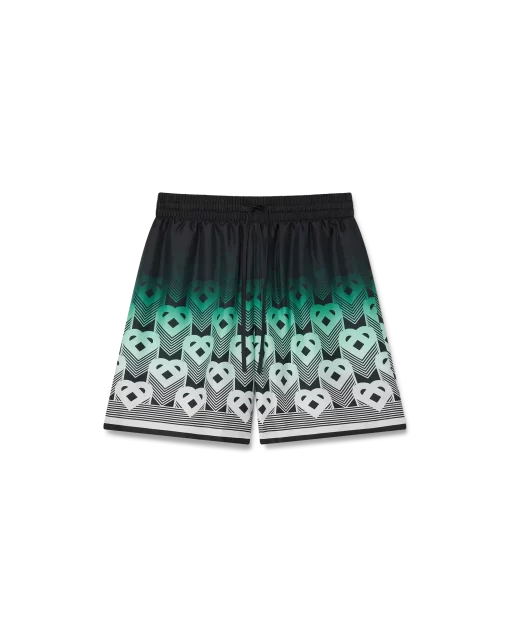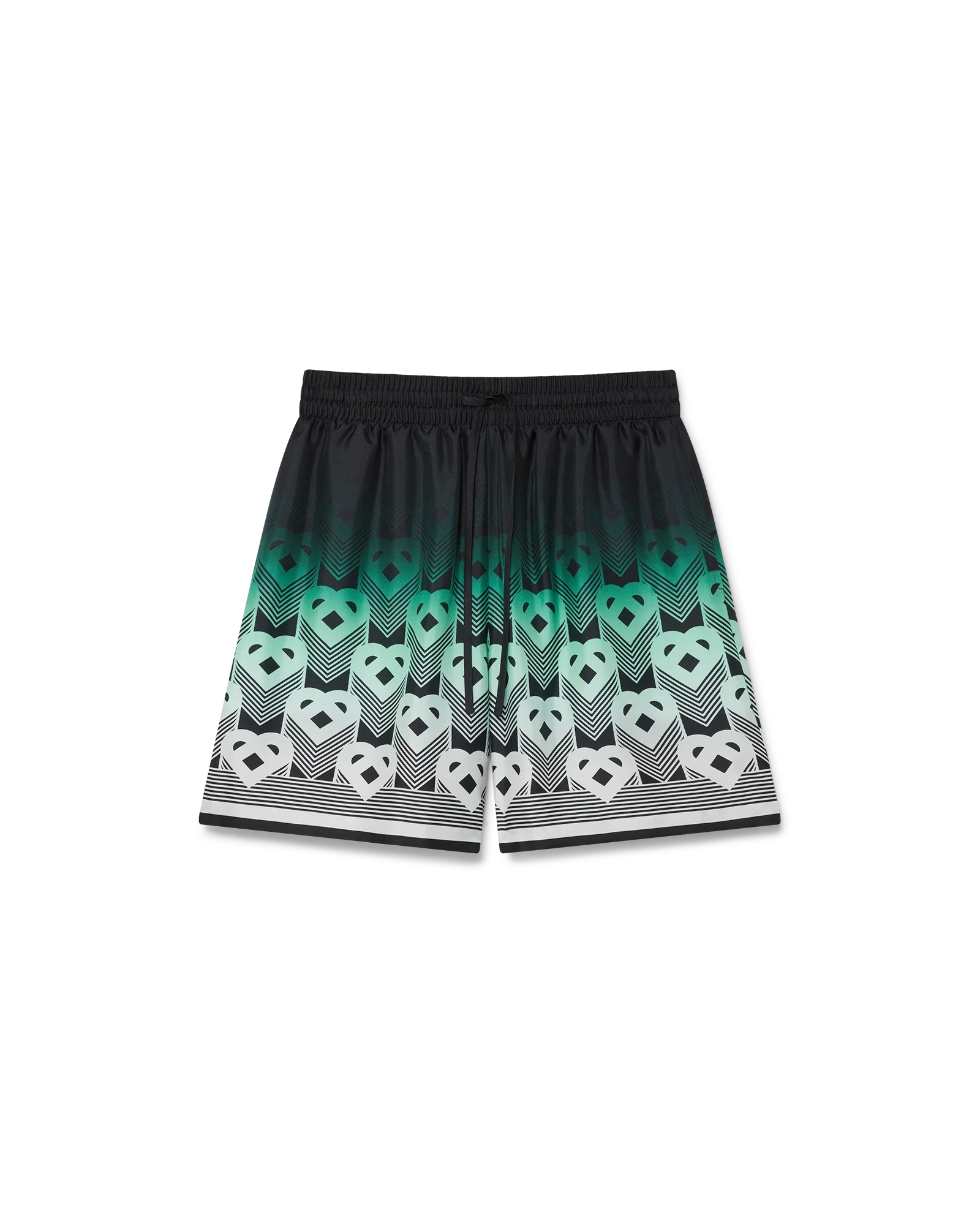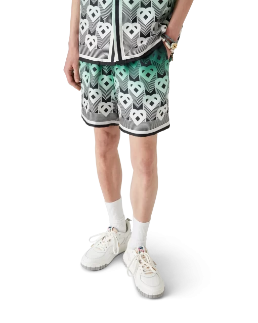 The Gradient Monogram silk shorts are an all-over printed design featuring the house’s heart monogram used against a mint gradient that uses the Park Hyatt colourway – an iconic Tokyo hotel that uses mint and black in its interior design – crafted from a monogrammed silk twill fabric. Completed with an elasticised waistband, drawstring fastening, side pockets, a back pocket and striped detail on the hem.