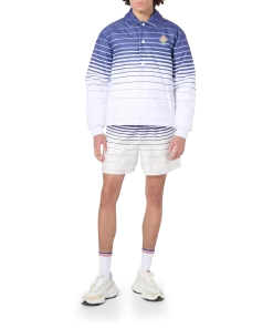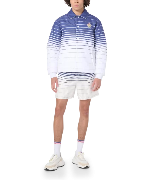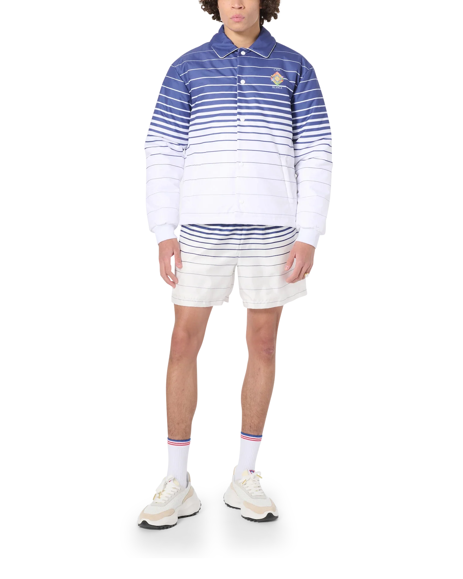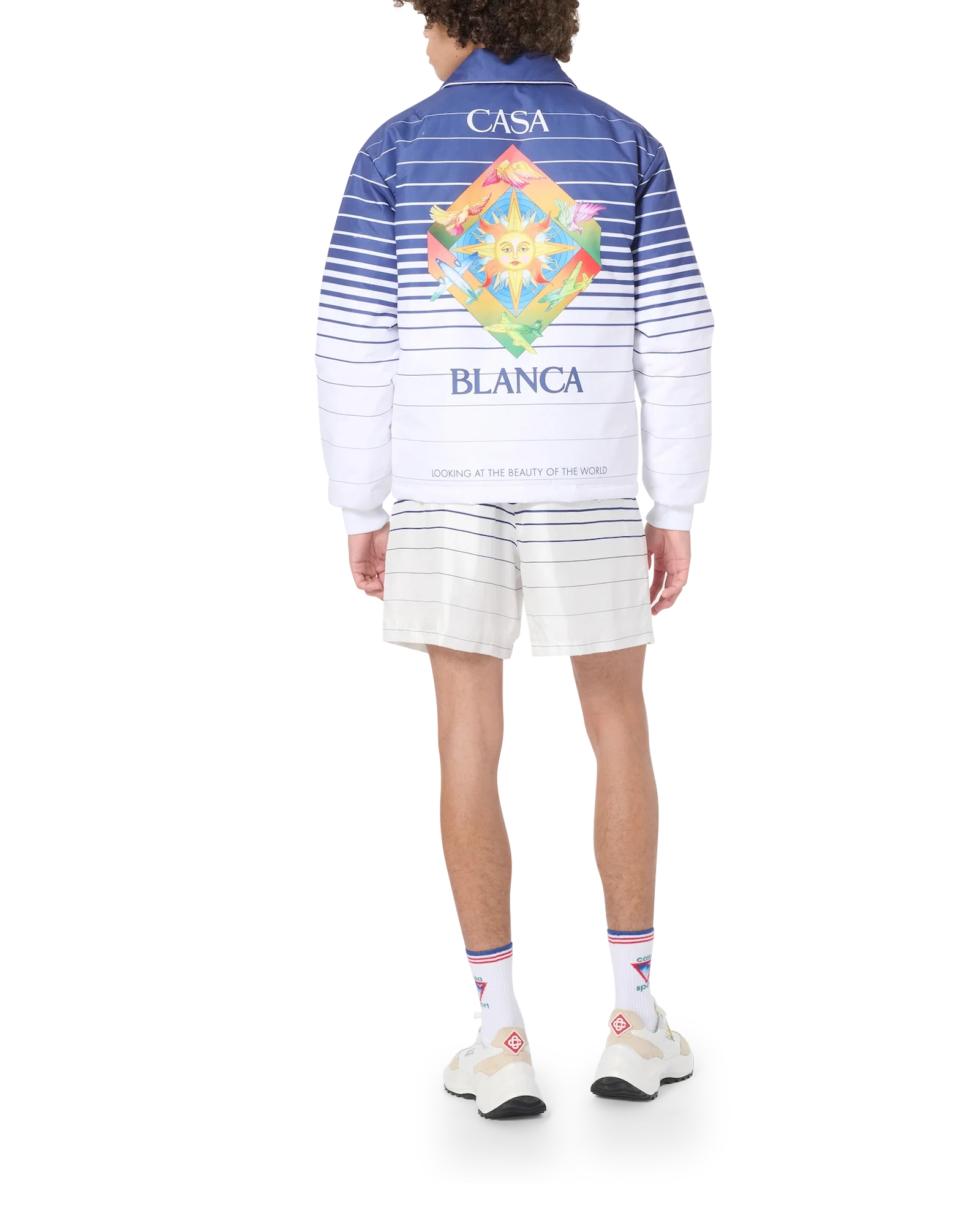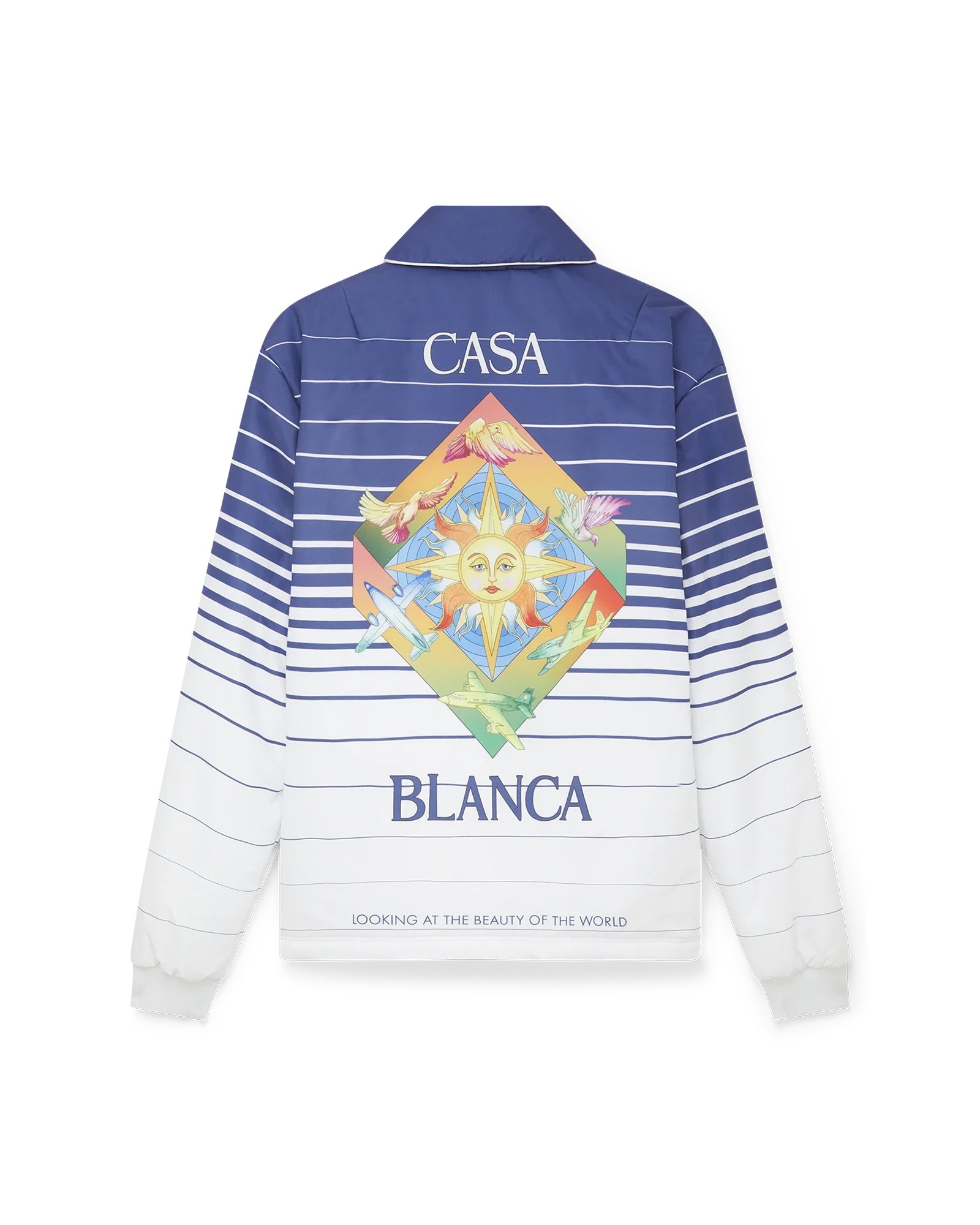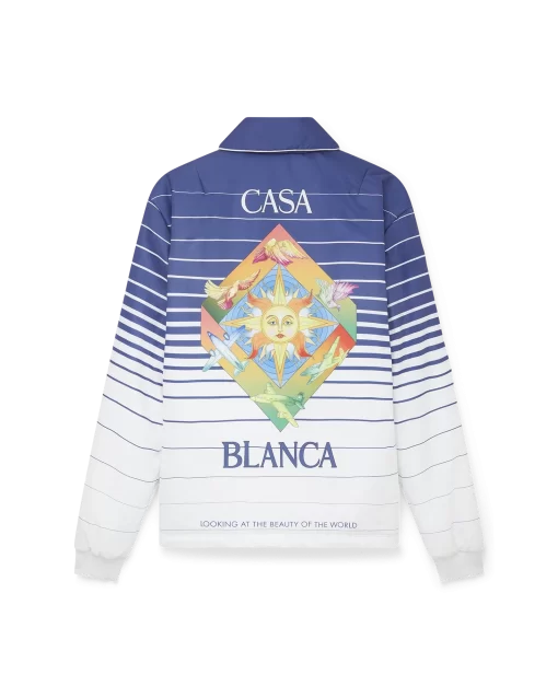 The Les Elements coach jacket features seasonal artwork incorporating Casablanca symbology and Arabic iconography, with peace doves. Finished with a drawstring fastening, front button closing and side pockets.