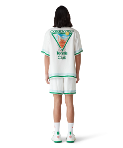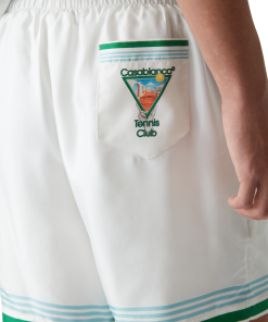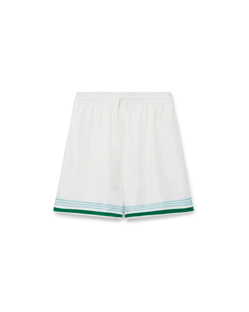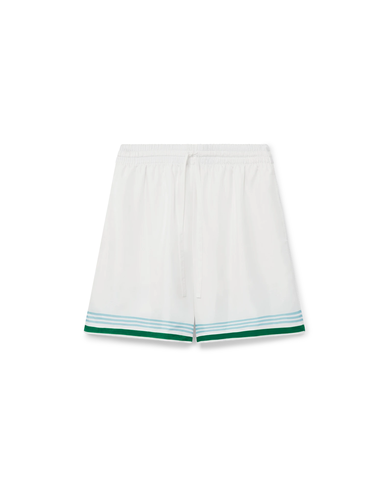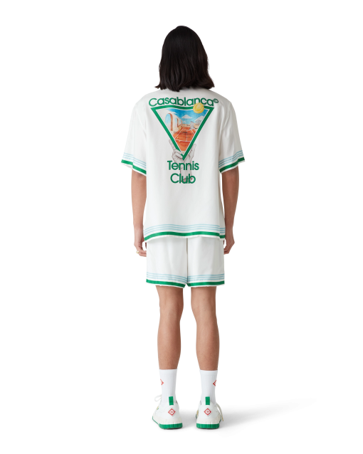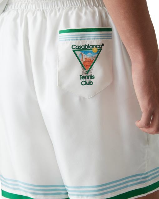 The Metaphysical Tennis Icon silk shorts are crafted from a silk twill fabric featuring the house’s seasonal artwork, inspired by the continued study of the classical beauty and contemporary allure of Ancient Greece, incorporating the house’s design elements of tennis, nature and architecture. Completed with an elasticated waistband, drawstring fastening, in-seam side pockets, a back patch pocket, and blue, white and green stripe detail on the hem and back pocket.