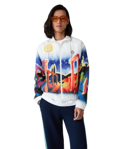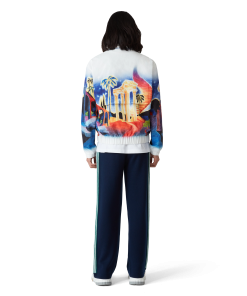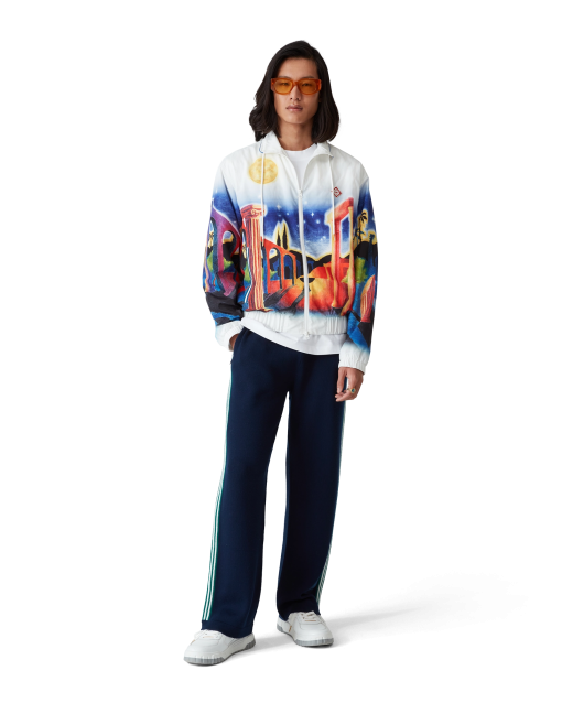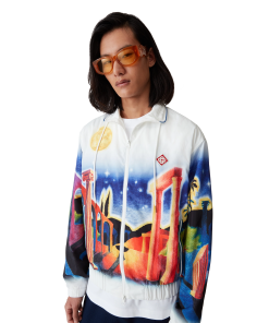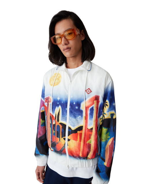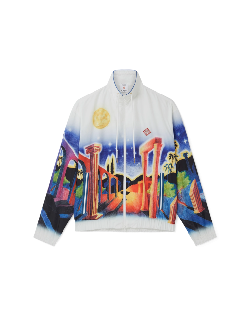 The Midnight Acropolis windbreaker jacket is a classic design featuring the house’s seasonal artwork paying homage to the beautiful night of Ancient Greece with the beautiful light from the temple and sky, crafted from a poly taffeta fabric. Completed with a funnel collar with blue piping edge detail and gold-tipped drawstring fastening, front zip closure, vertical zip pockets with stripe detail, a rain shield with a mesh ventilation strip, mesh lining, and elasticated cuffs and hem.