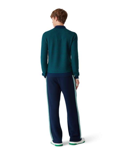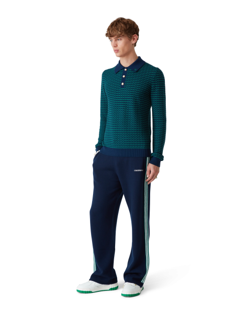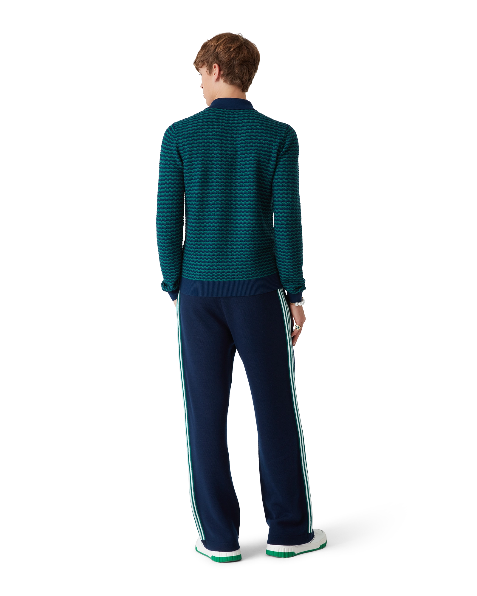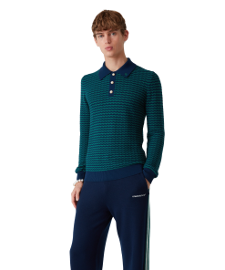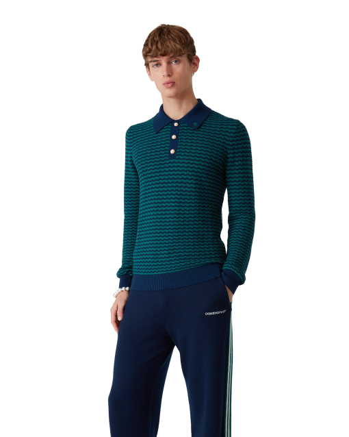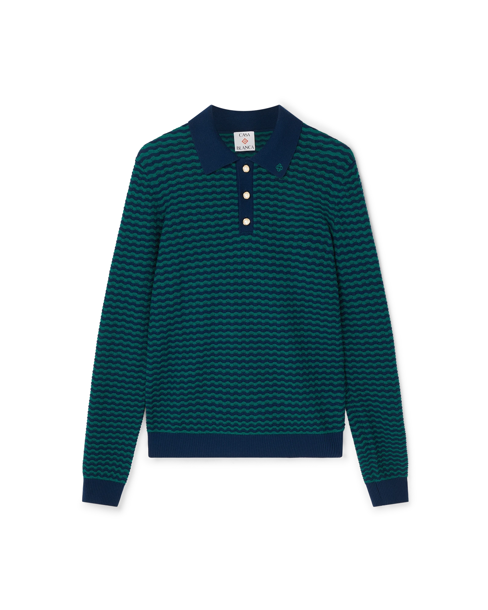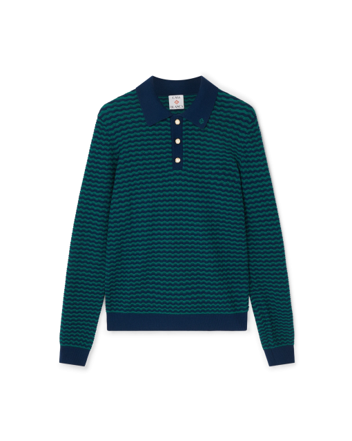 The mini wave polo shirt is a classic long-sleeve design crafted from merino wool fabric. Completed with rib collar, cuffs, hem, placket, and signature gold rim pearl buttons.