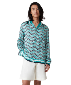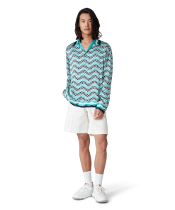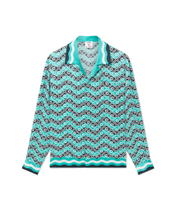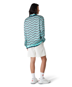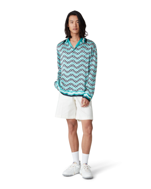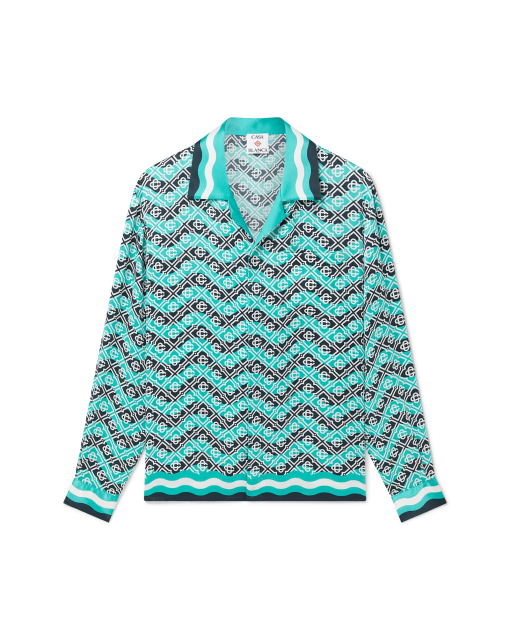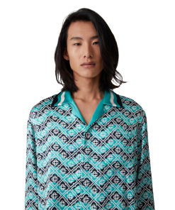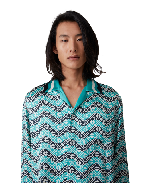 The Monogram Wave silk shirt is an all-over printed style in the house’s signature monogram crafted from a silk satin fabric. Completed with front button closure with interlocking CC corozo buttons, gold rim enamel buttons on the cuffs, a Cuban collar, and Memphis-wave-inspired stripe detail in the collar, cuffs, and hem.