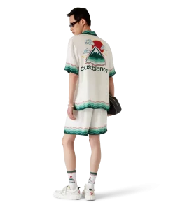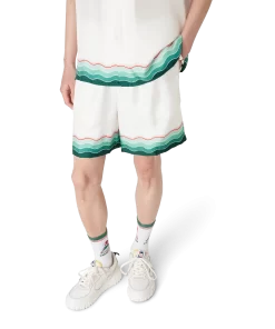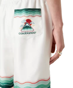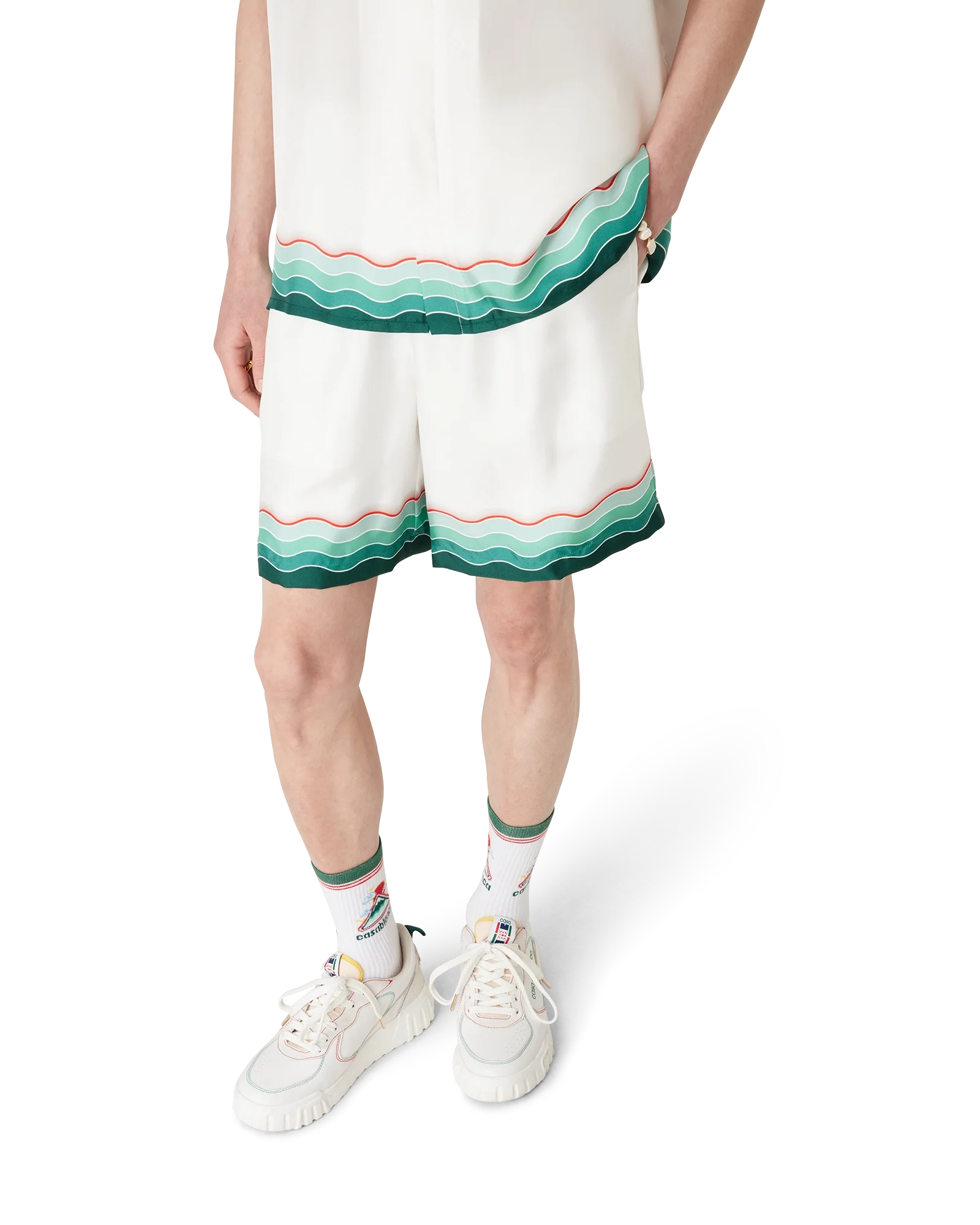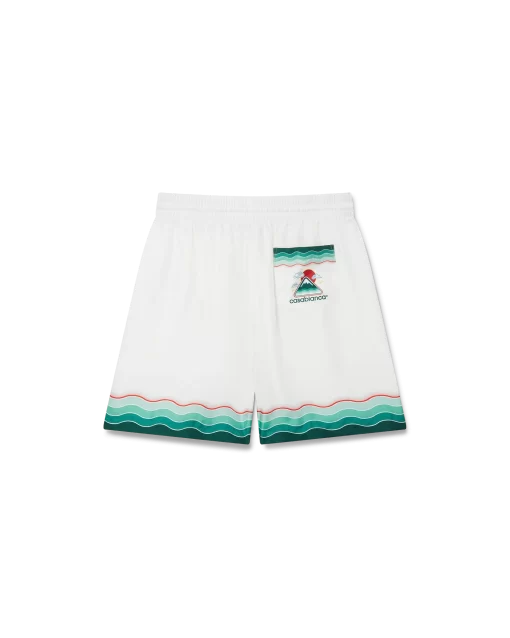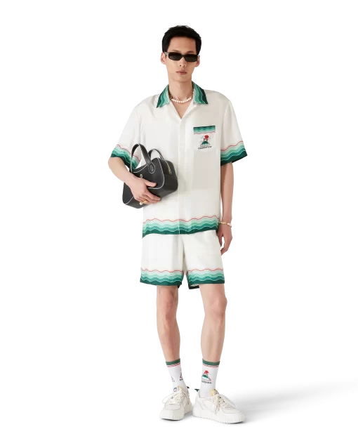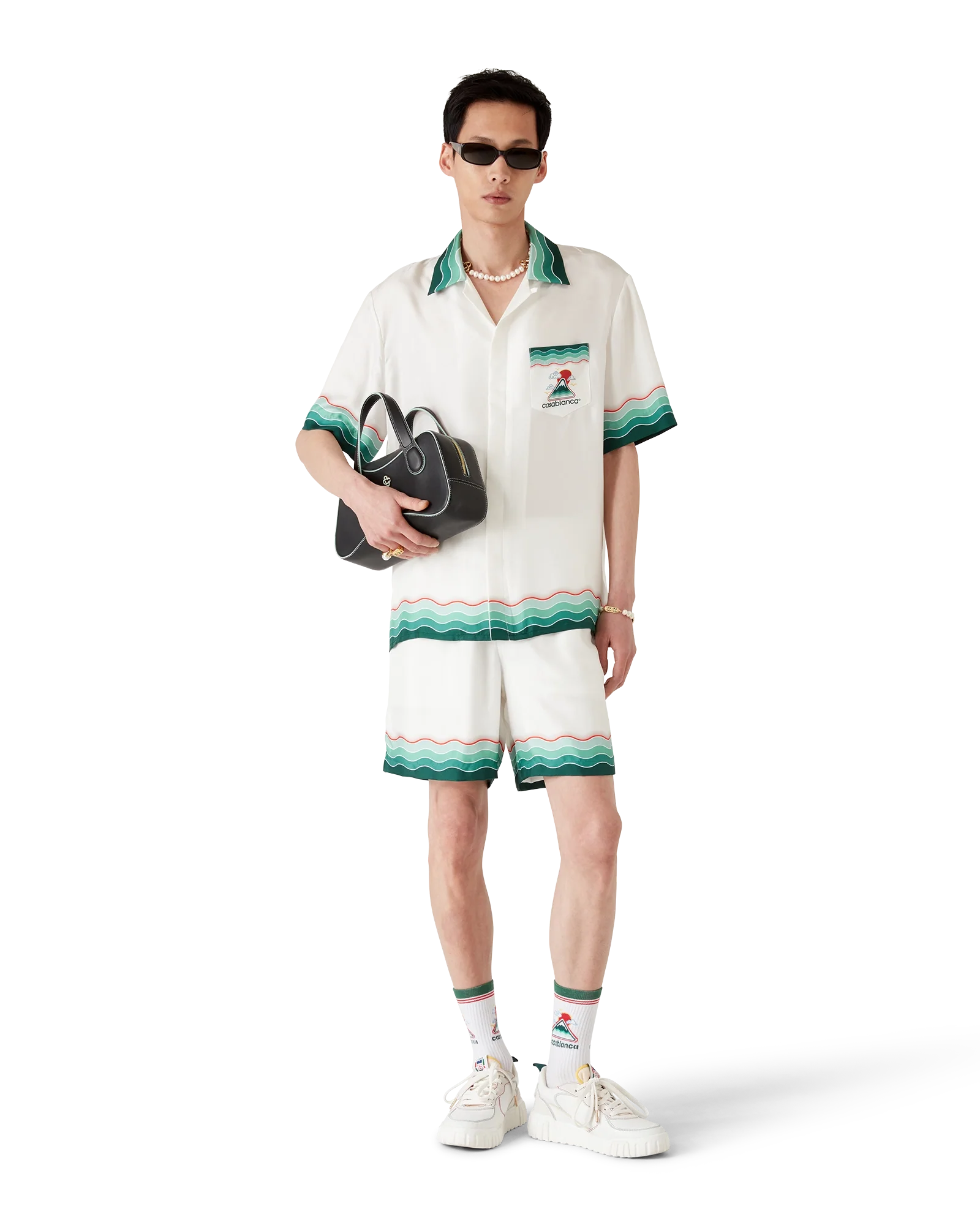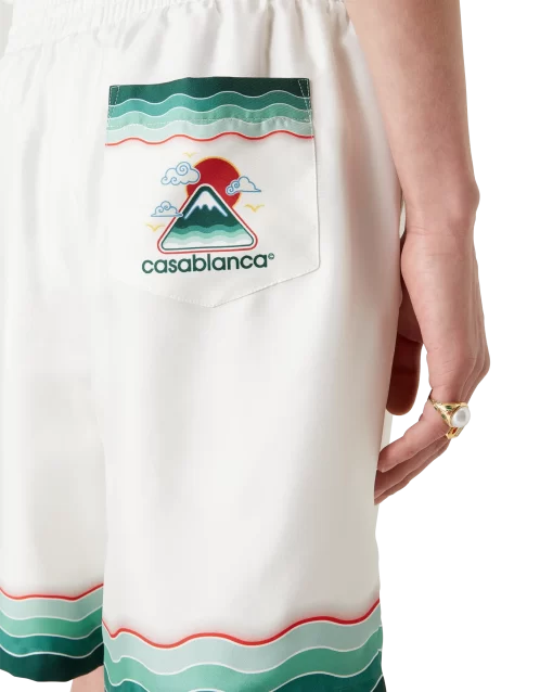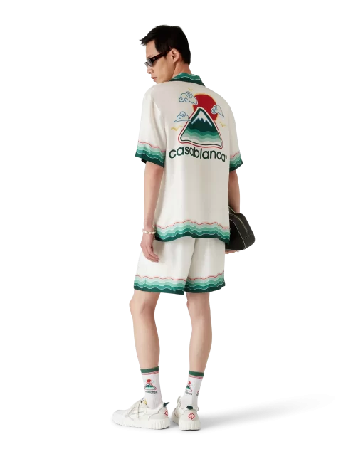The Montagne Ondulee silk shirt is a short-sleeve all-over printed design featuring the house’s seasonal artwork – using Japan’s rich iconography as inspiration for this collection, with a simple layout and artwork, conveying a strong visual message with just a few lines and colours, making it one of the emblems of the collection – crafted from silk twill fabric. Completed with an elasticised waistband, drawstring fastening, in-seam side pockets, a back pocket and Memphis wave-inspired stripe edge detail on the hem and back pocket.