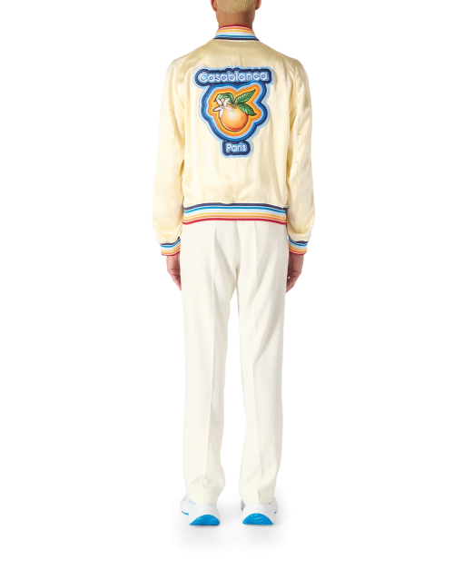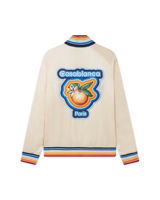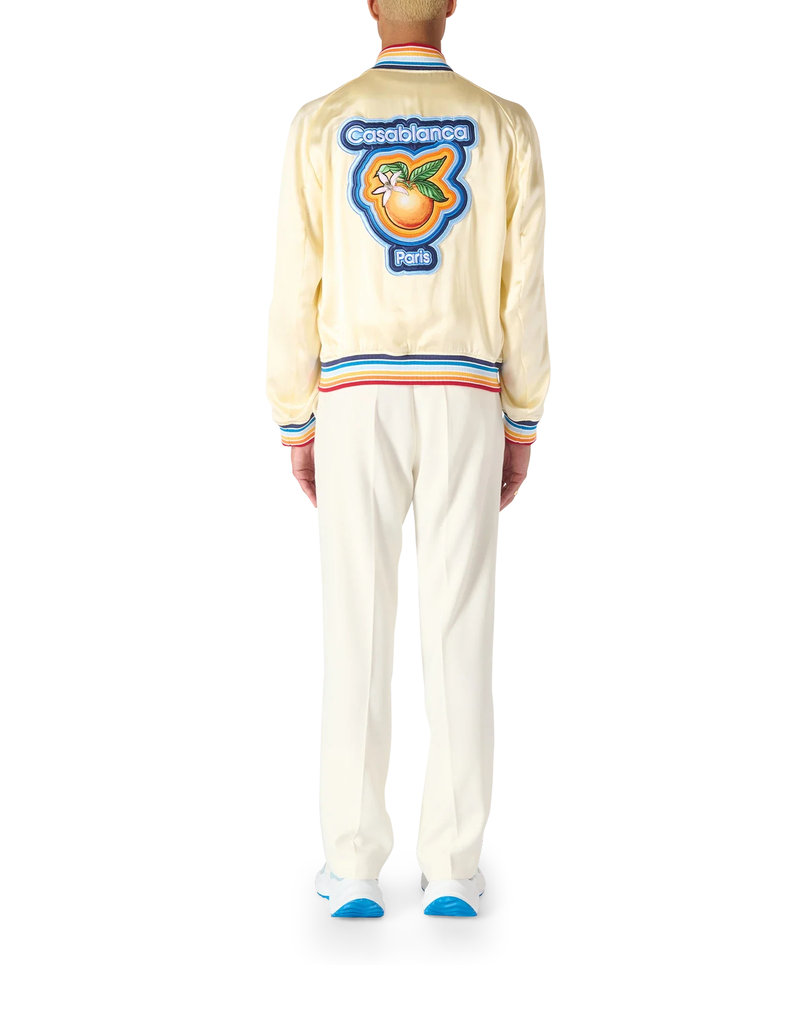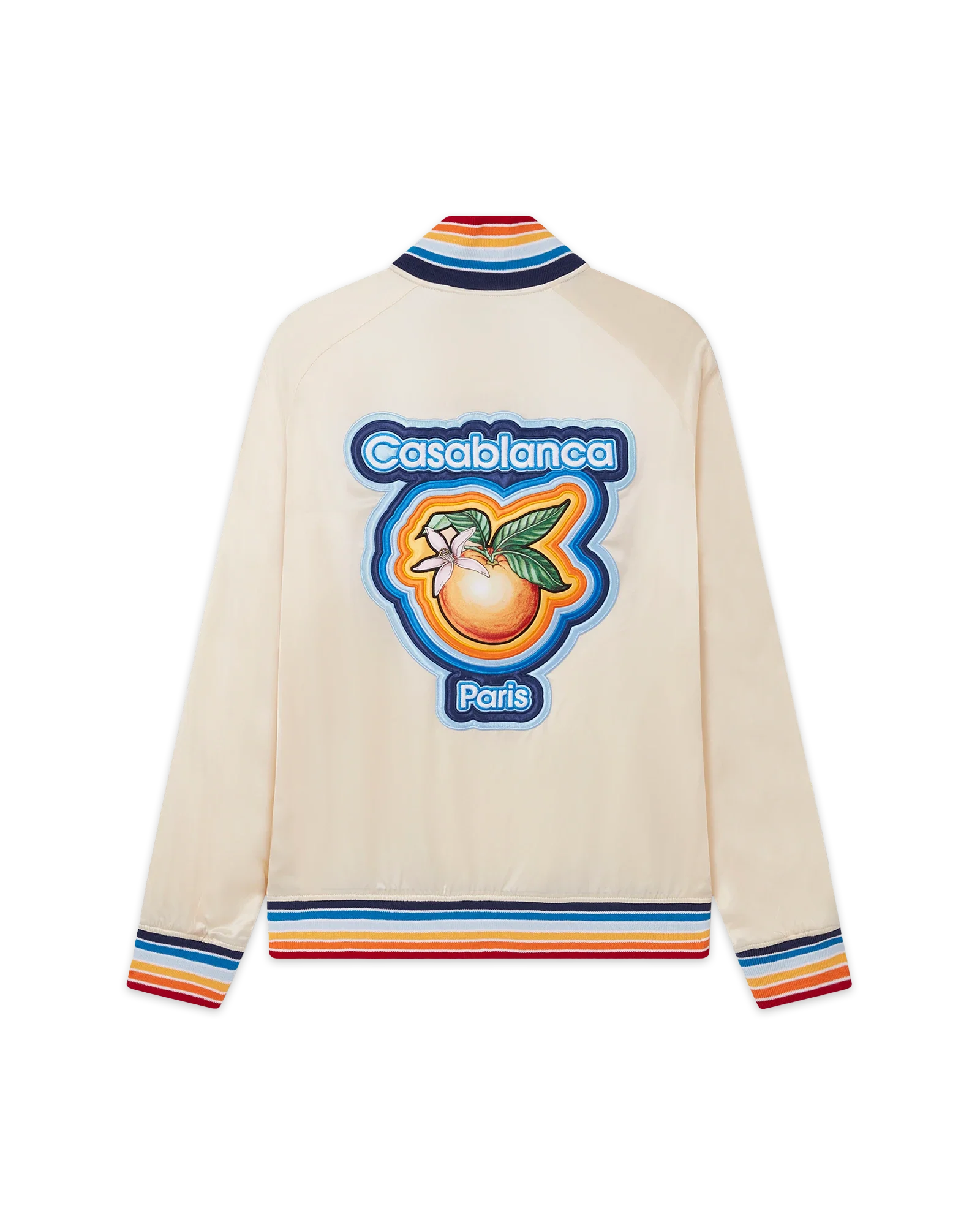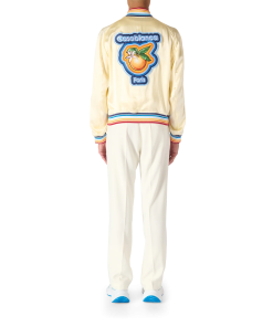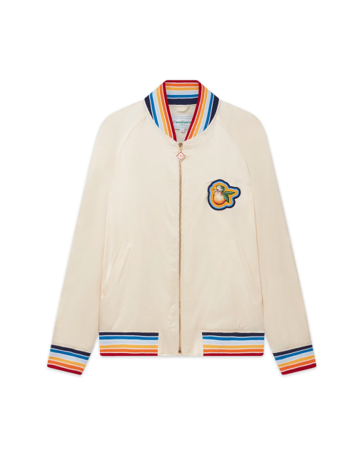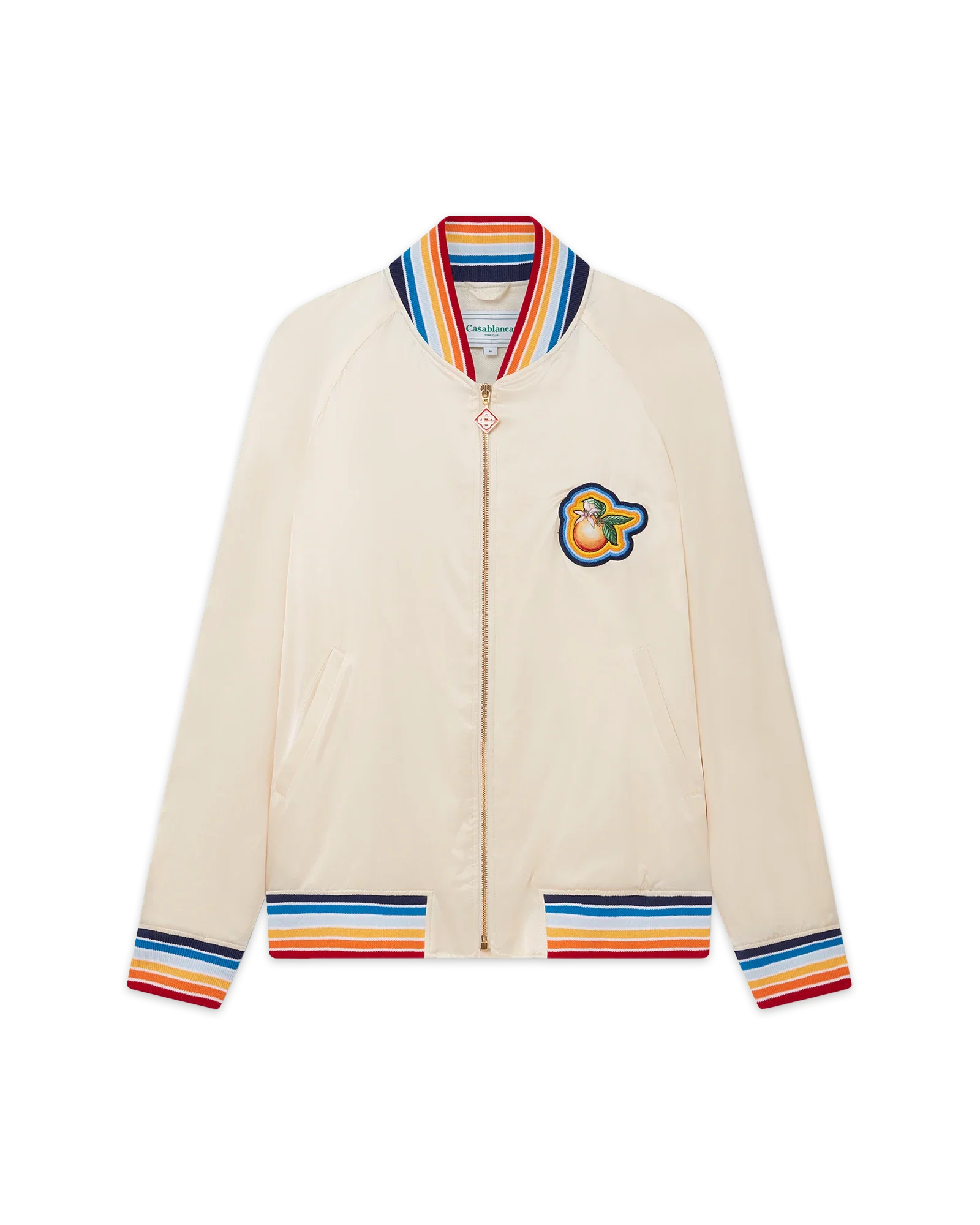 The Radiating Orange long-sleeve silk satin bomber jacket features seasonal artwork inspired work of Mexican artist Pedro Linares with Casablanca symbology. Finished with a contrast rainbow ribbed hem, front zip fastening, and two front pockets.