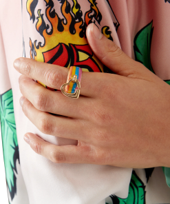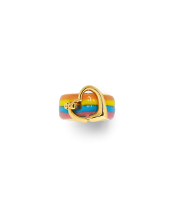 The stripe heart ring is crafted from gold-plated brass and enamel. Completed with a gold-plated inner band with an external stripe enamel and a gold-plated heart held by a gold-plated head.