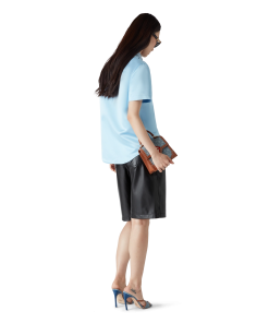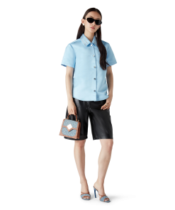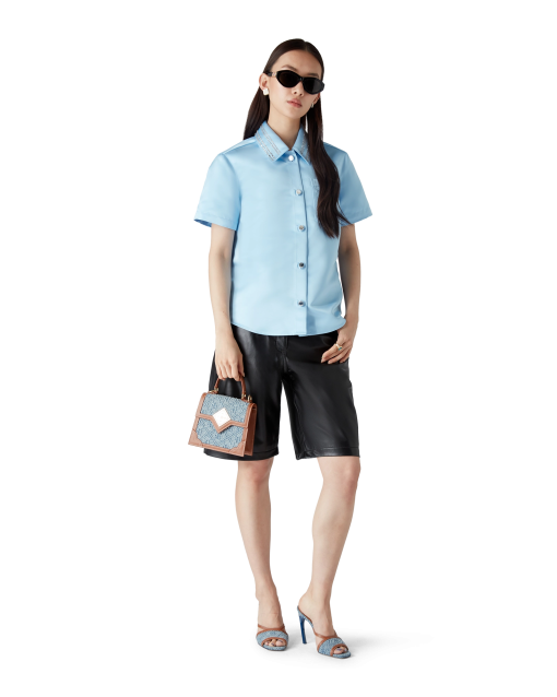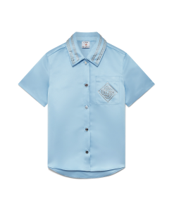 The satin short-sleeve shirt is a classic design crafted from satin fabric. Completed with button closure, branded gold-plated buttons, a point collar, a curved hem, a breast pocket, and beading detail on the collar and breast pocket.