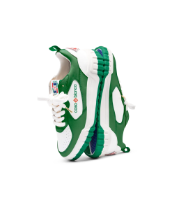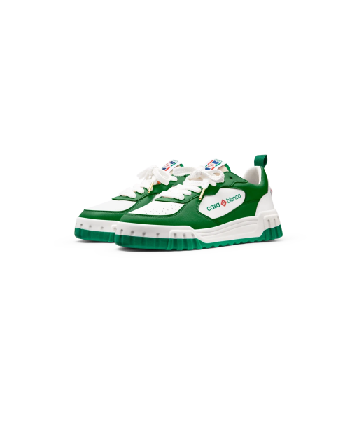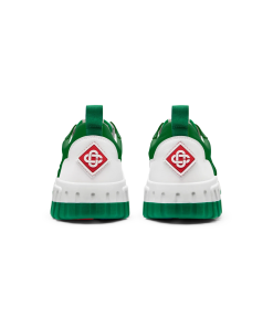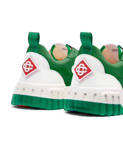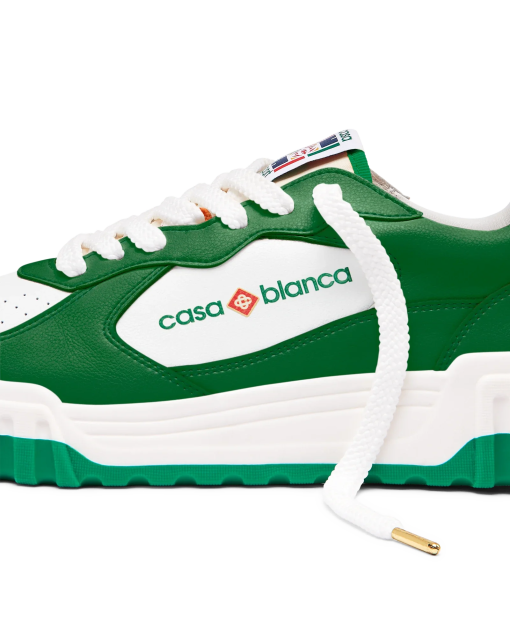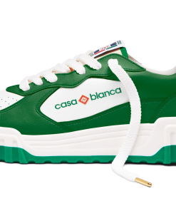 The upper of the shoe features integrated, flowing panel lines as a nod to the iconic silhouettes of the 90s. Prominent Casablanca branding throughout is evident, including the brand’s signature diamond motif on the heel, silicone wordmark lateral panelling and the woven tennis court motif tongue label and insole, giving rise to its name, The Court.
