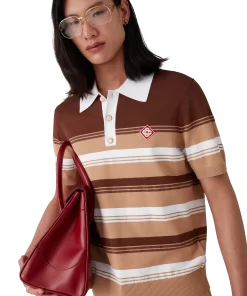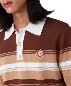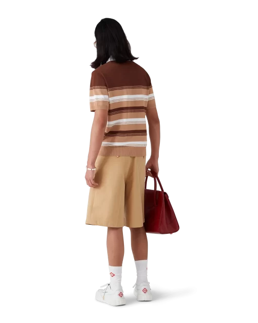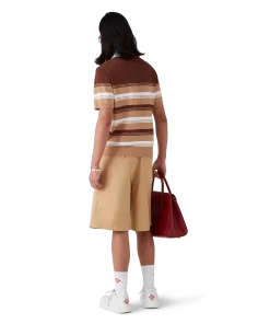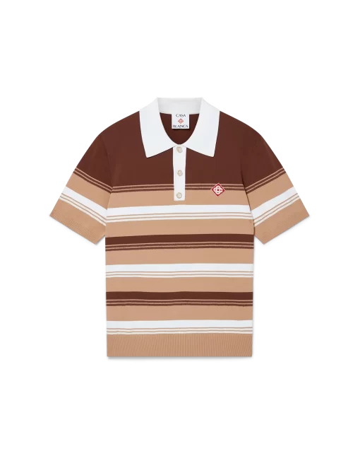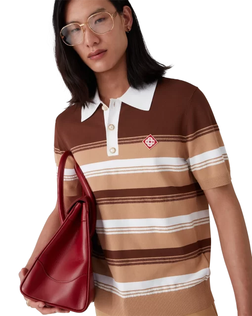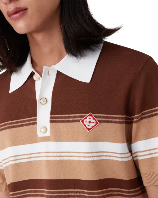 The stripe polo shirt is a short-sleeve design crafted from stripe knitted fabric featuring the house’s signature diamond logo. Completed with signature gold rim pearl buttons, three-button placket, and rib cuffs, hem, collar and placket.