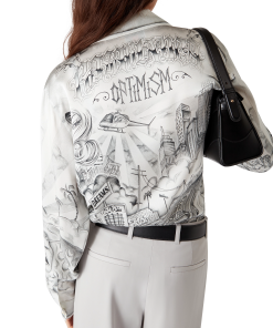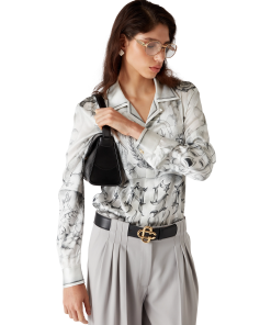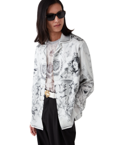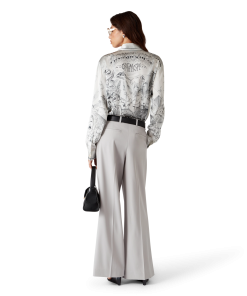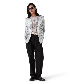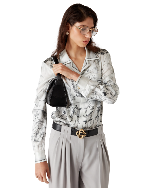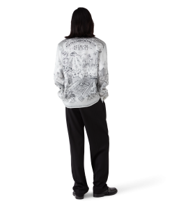 The Tattoo silk shirt is a long-sleeve design crafted from a printed silk satin fabric featuring the season’s artwork, inspired by the LA neighbourhood scene referencing the rich tattoo culture and the grey and black inks that are used in these tattoos. Completed with a Cuban collar, a breast pocket, hidden button closure with interlocking CC corozo buttons, and a gold rim enamel button on each cuff.