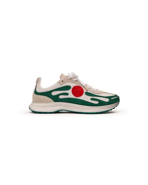 The Men’s White and Green Stade Sneaker takes its name from the Ancient Greek measurement for the distance of a foot race, which later became the word for stadium. The style is inspired by performance running shoes and is a transportation of modern technology from ancient tradition, the codes of modern running with the lightweight mesh and glow print add to the modernity. The sole features sculptured curves, which is a reference to our Atlantis shoe and a stable of Casablanca design.