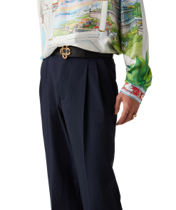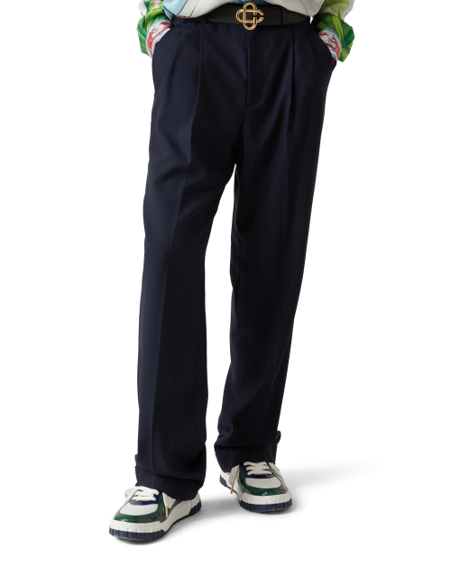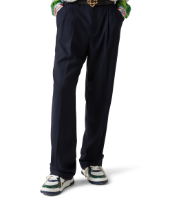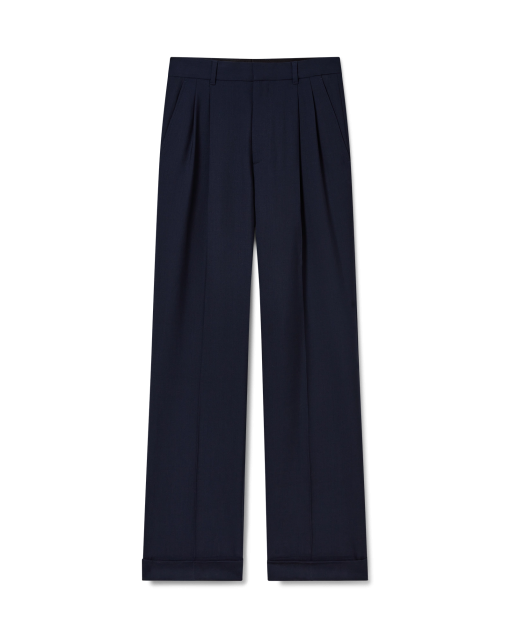 The wool tailored pleated trousers are a slim design crafted from virgin wool fabric and feature a cotton blend lining. Completed with front pleats, belt loops, zip closure, slanted side pockets, and welt back pockets.