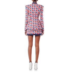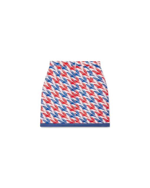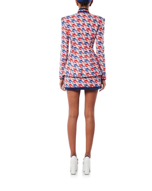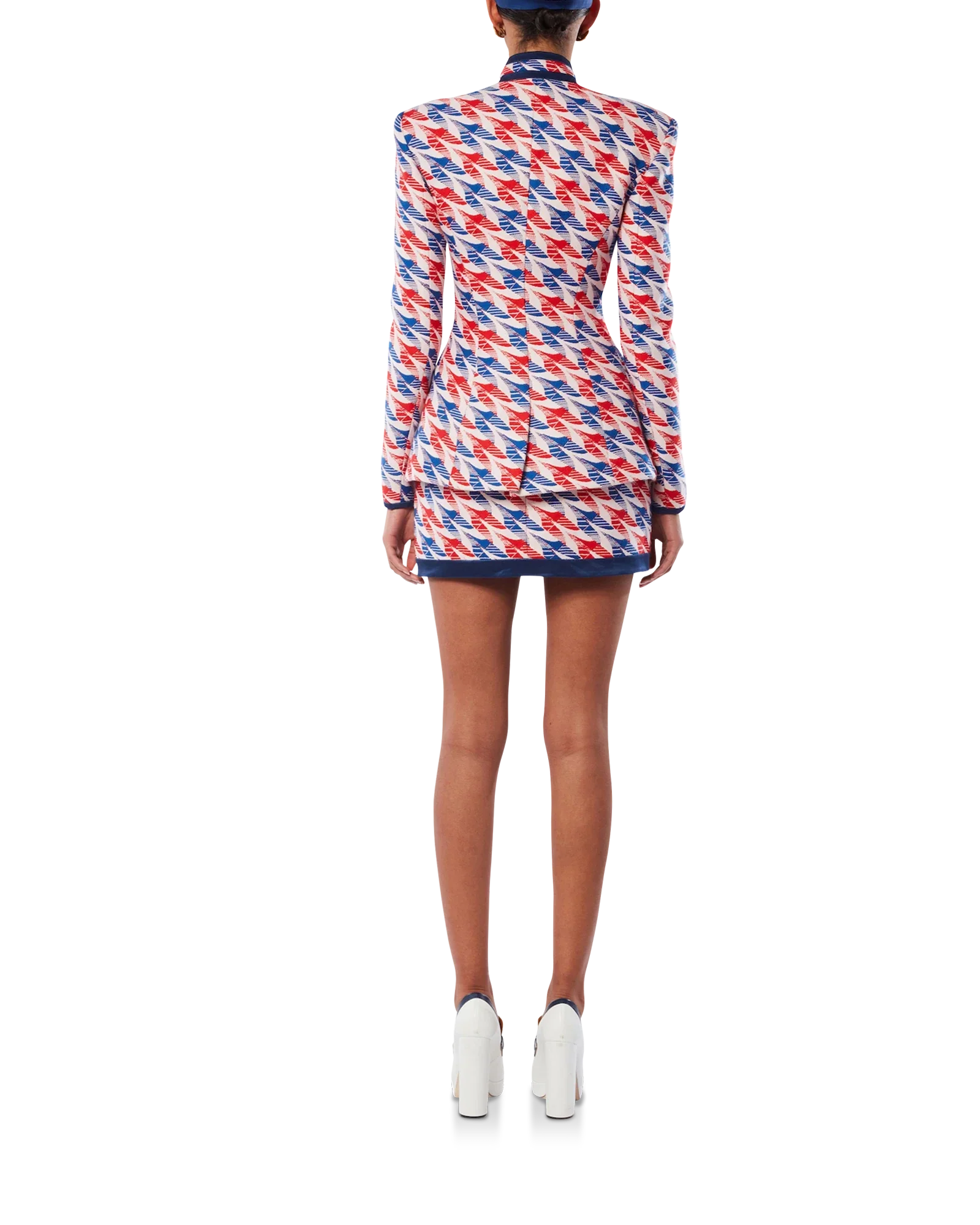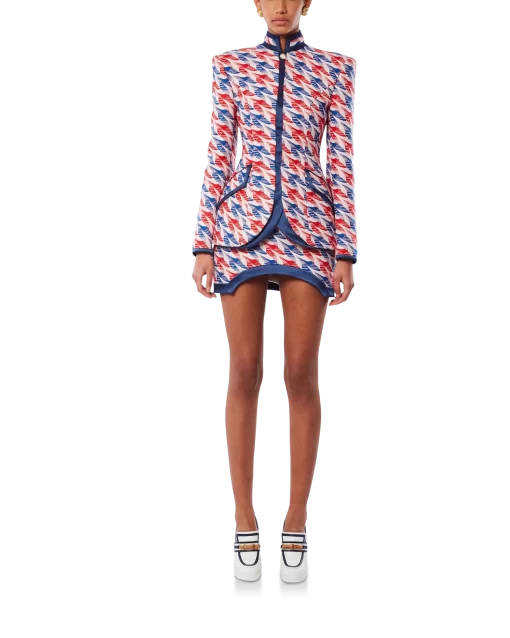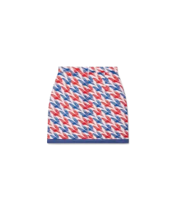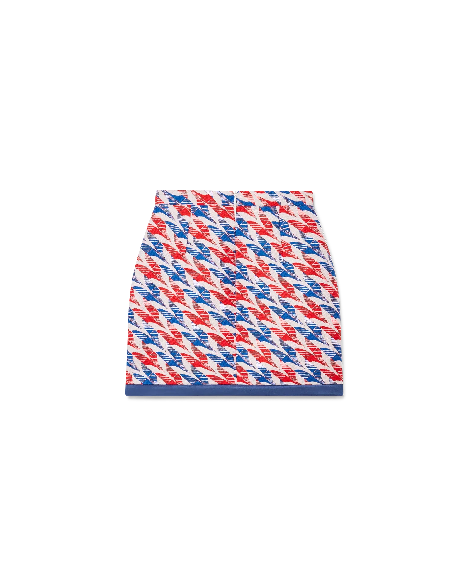 The Aviation Houndstooth curved hem mini skirt features the seasonal aviation check in a plane-like silhouette that embodies the palette of France’s Tricolore, crafted from a wool blend fabric. Completed with a cotton blend lining, and a contrast silk trim.