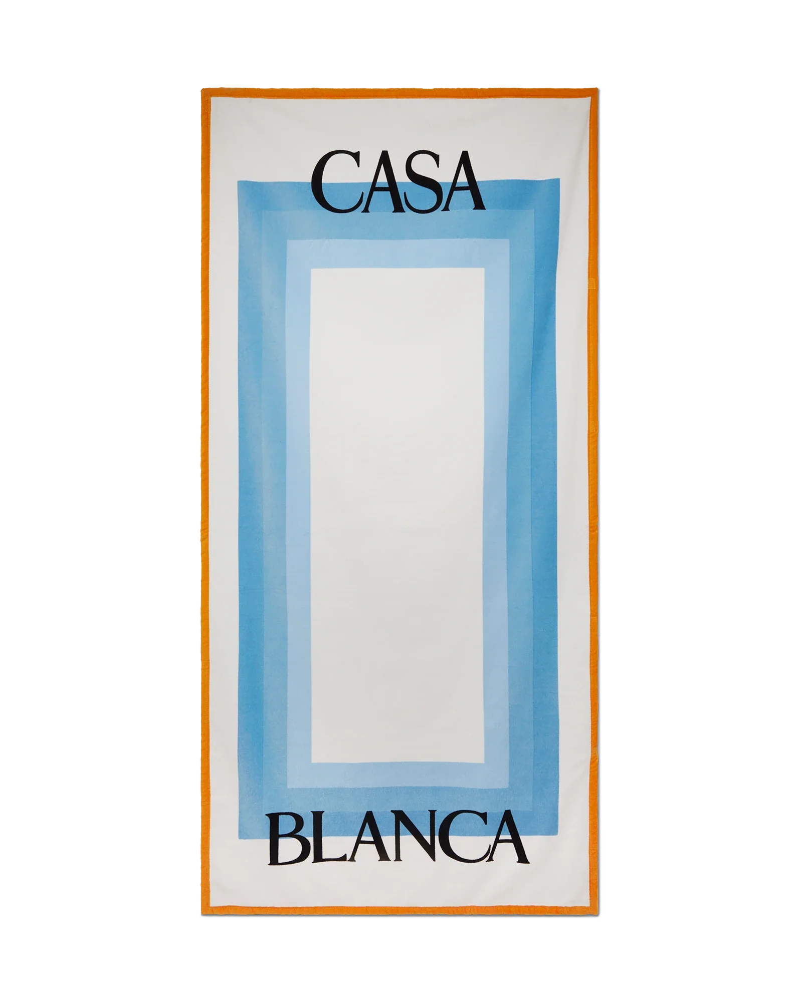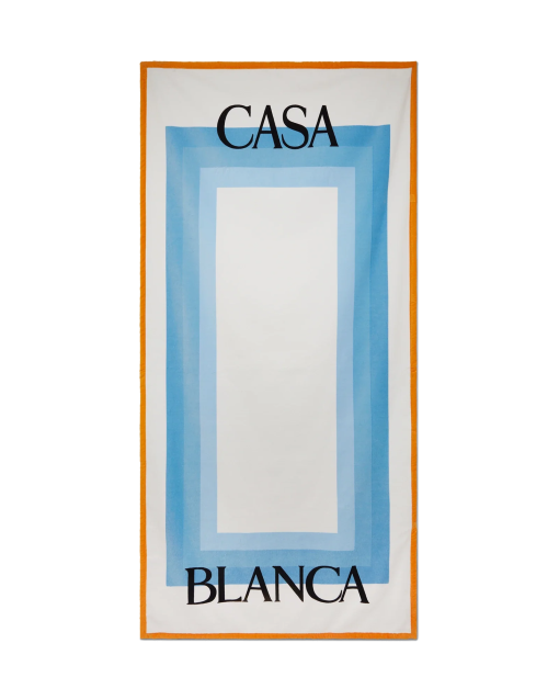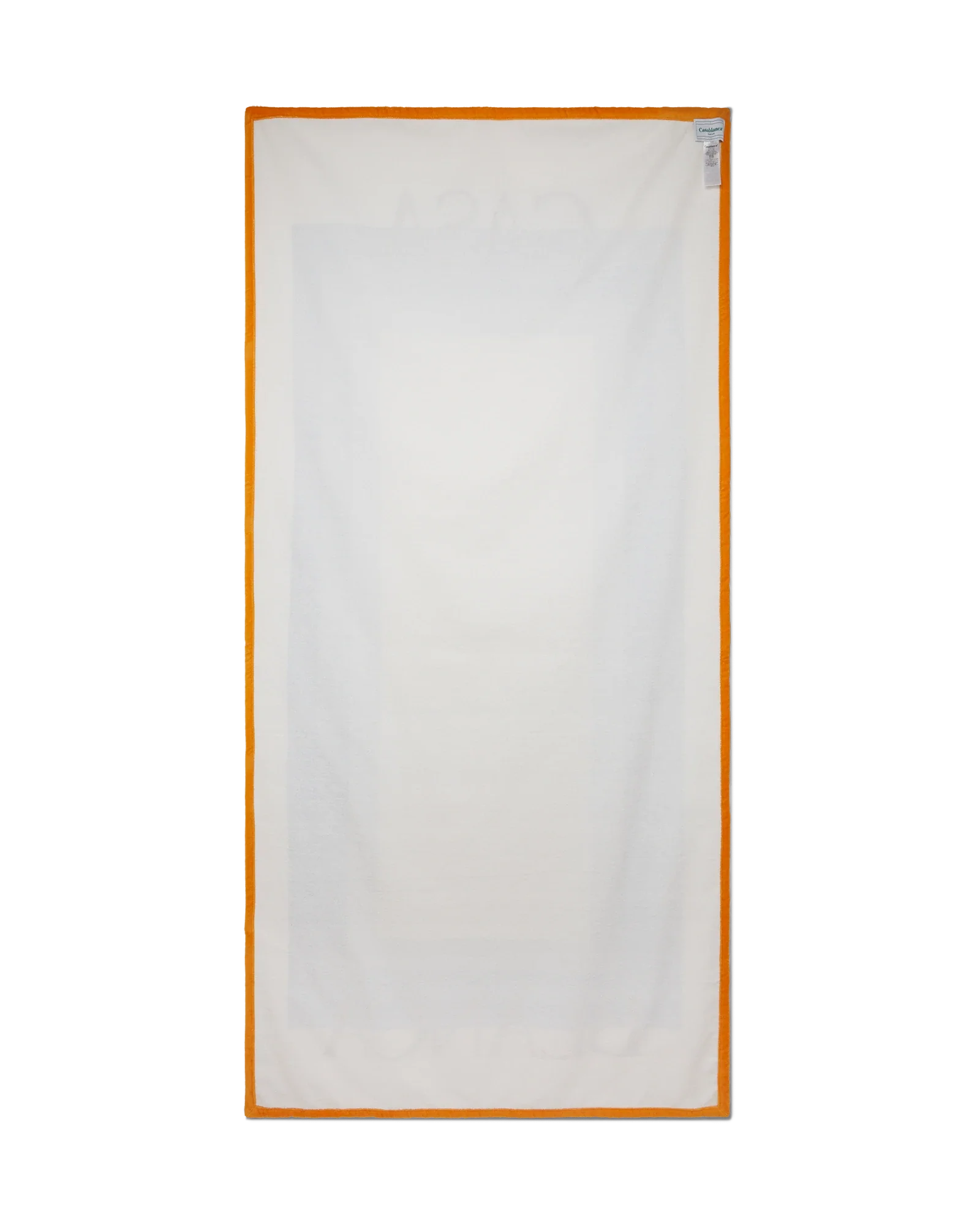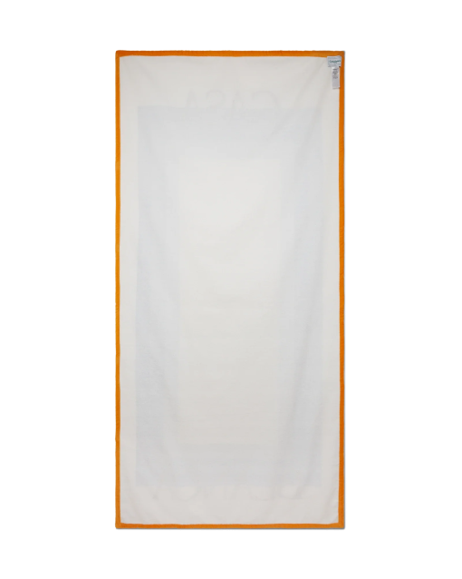 A terry cotton towel features the house’s signature logo artwork with an orange border.