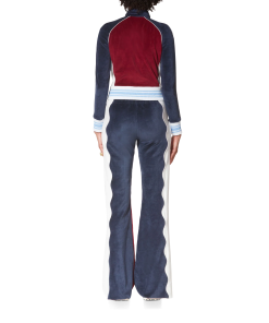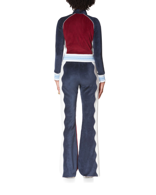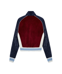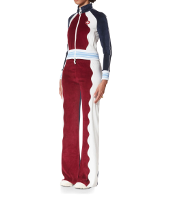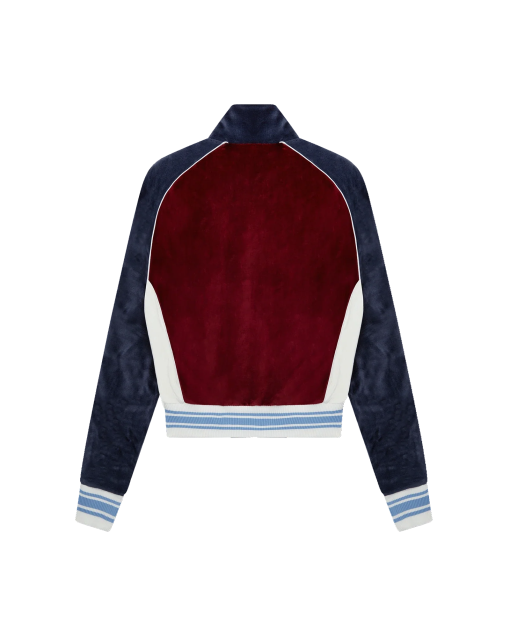 The Burgundy Velour Panelled track jacket is a sportswear design inspired by the Memphis wave, featuring the house’s interlocking CC logo. Finished with zip closure, rib cuffs and hem, and a Casablanca branded label.