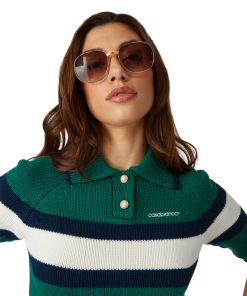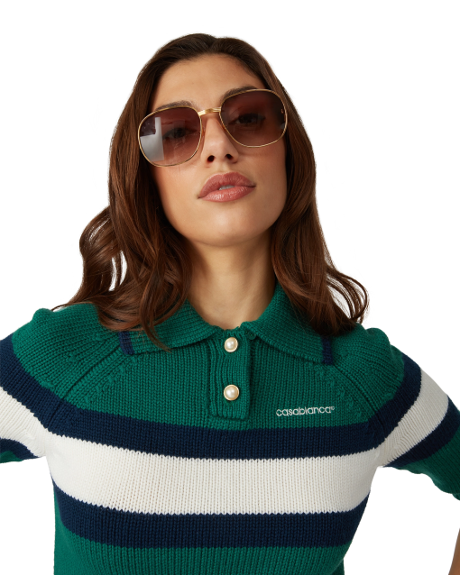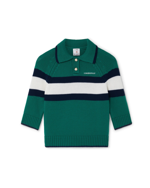 The colour block polo shirt is a cropped long-sleeve design crafted from merino wool fabric and features a blue and white stripe across the chest and back. Completed with raglan sleeves, ribbed cuffs, hem and collar, signature gold-rim pearl buttons and Casablanca logo.