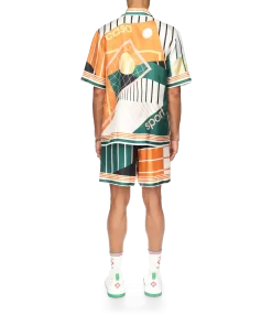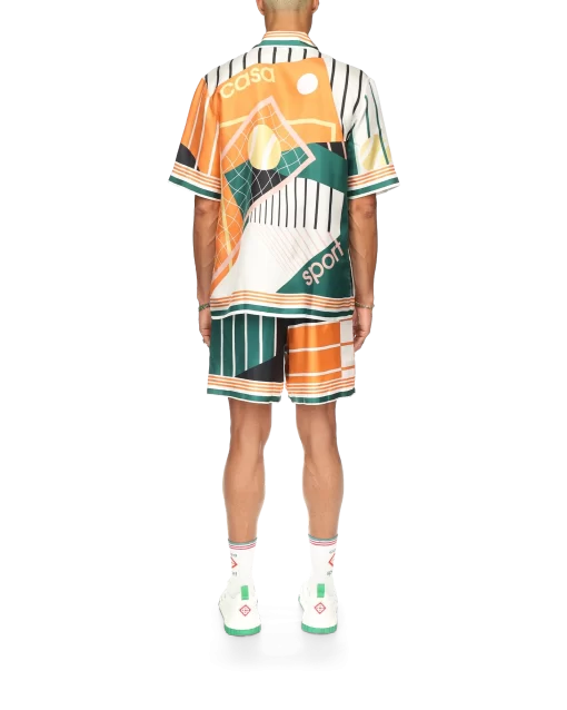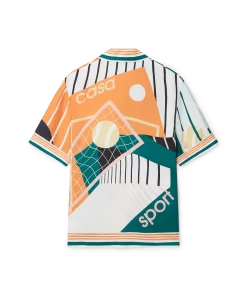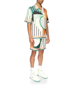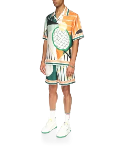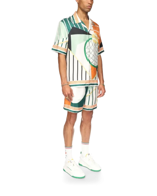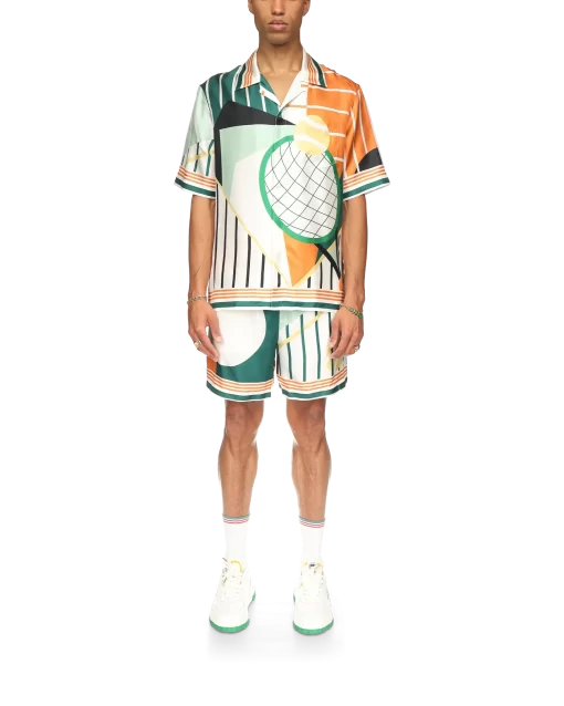 The Court Abstrait silk shirt is a short-sleeve all-over print design featuring the house’s classic iconography artwork of tennis equipment. Finished with stripe detailing on the collar, cuffs and hem, button closure and Casablanca branded label – designed for a classic Fits.