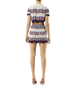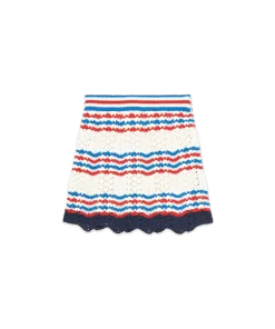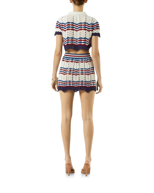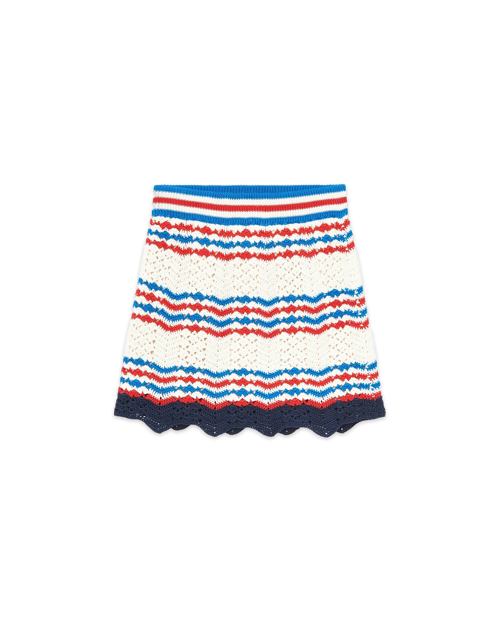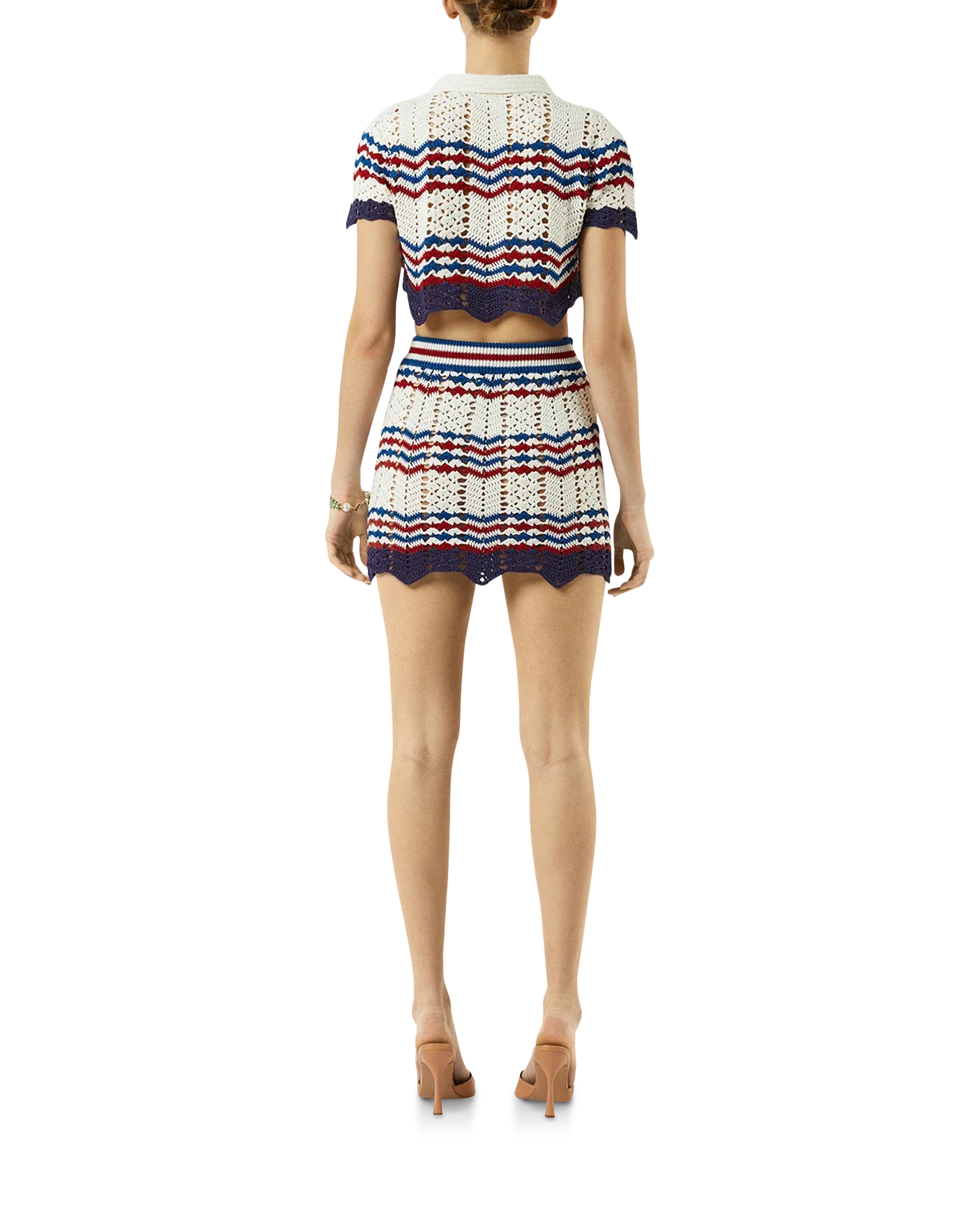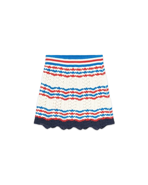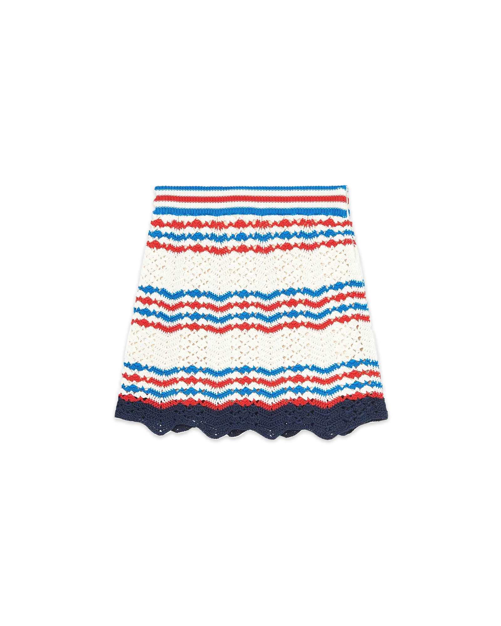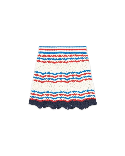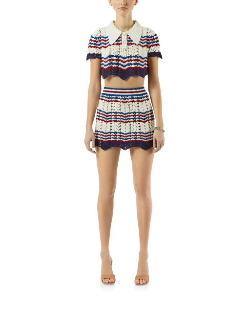 The crochet chevron a-line skirt is a mini skirt style with a familiar silhouette. Crafted from the house’s signature open-weave crochet fabric, this piece is completed with an elasticated waistband.