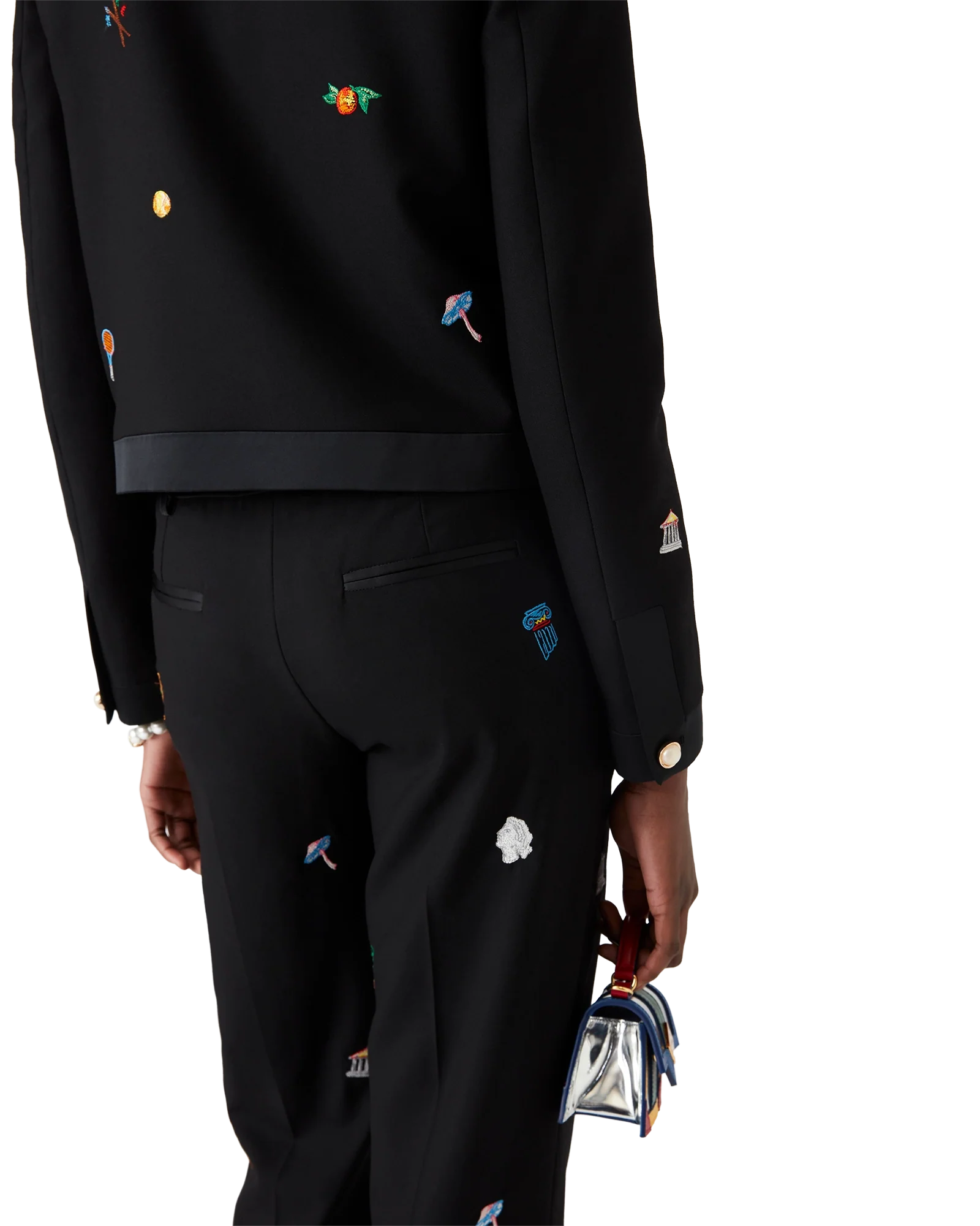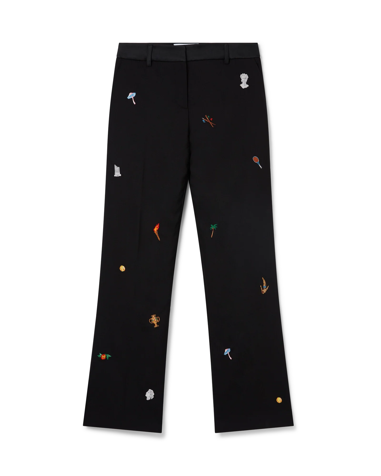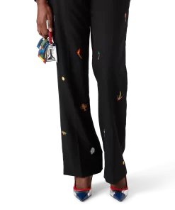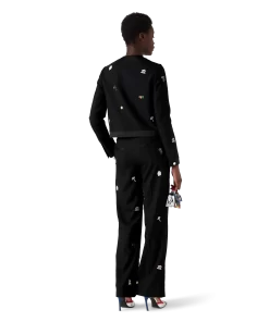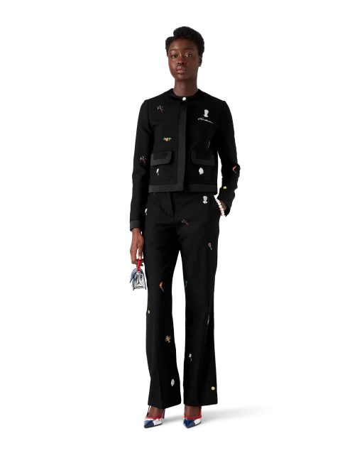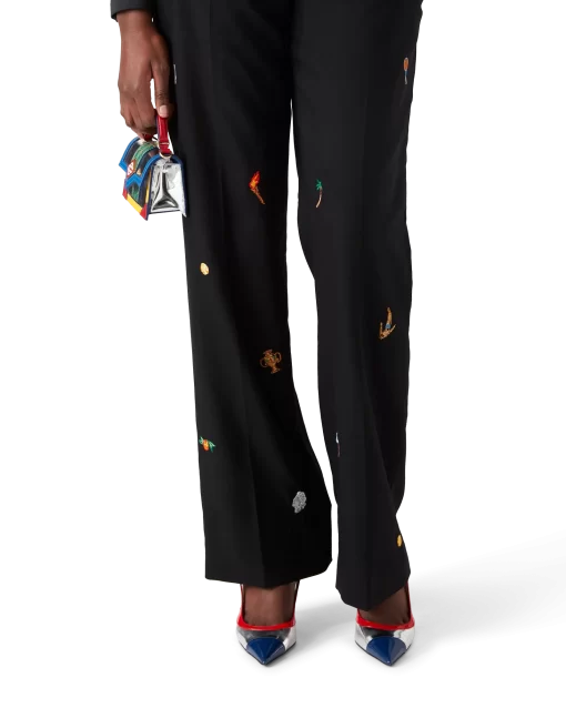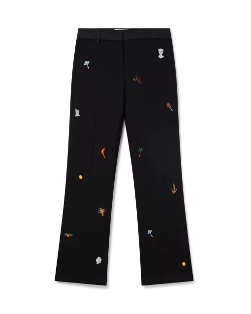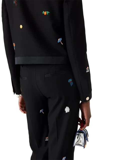 The embroidered motif wool tailored trousers are a slim silhouette crafted from embroidered wool fabric. Finished with embroidered artwork representing the house’s symbology with nature and architecture, slanted side pockets, a lining, zip closure, belt loops, and back pockets. Intended to be worn with its coordinating jacket.