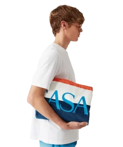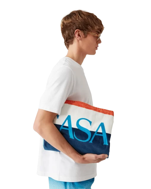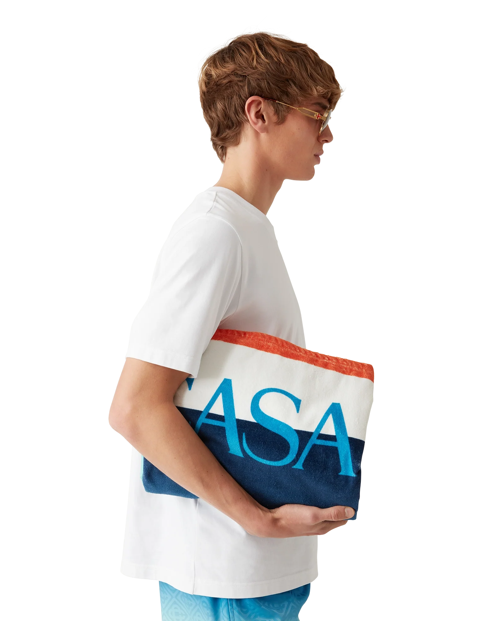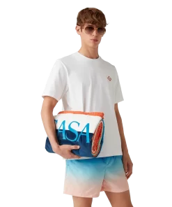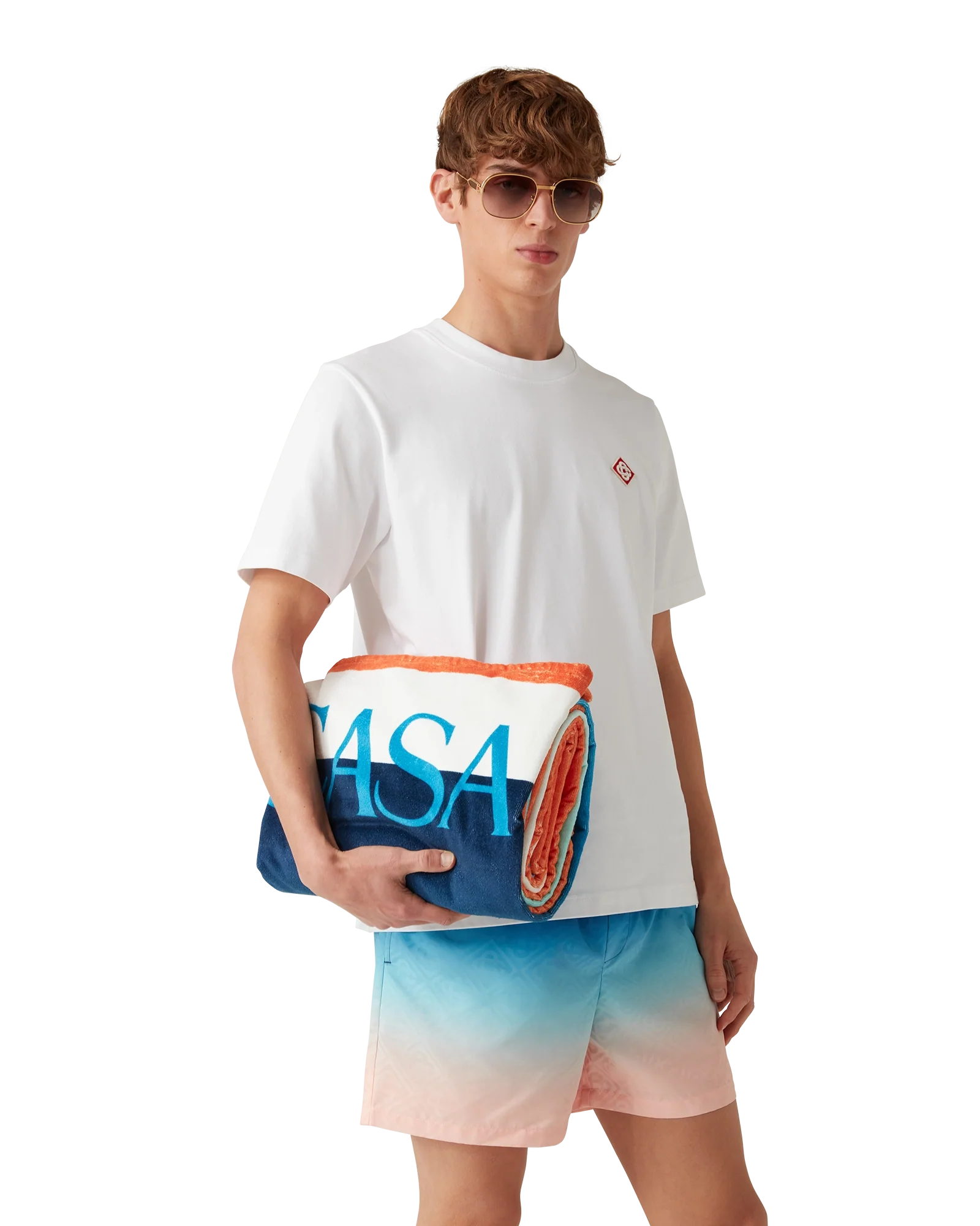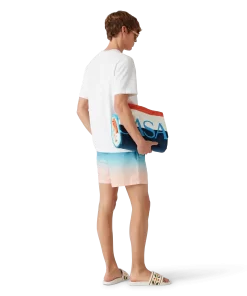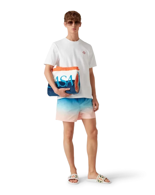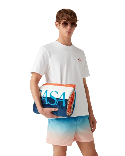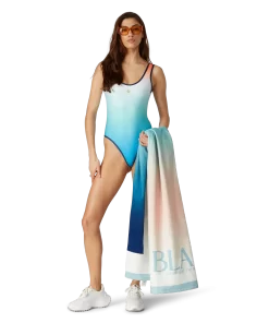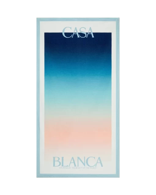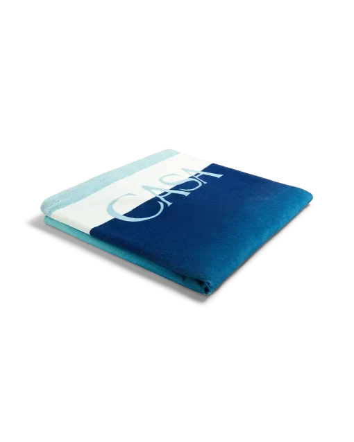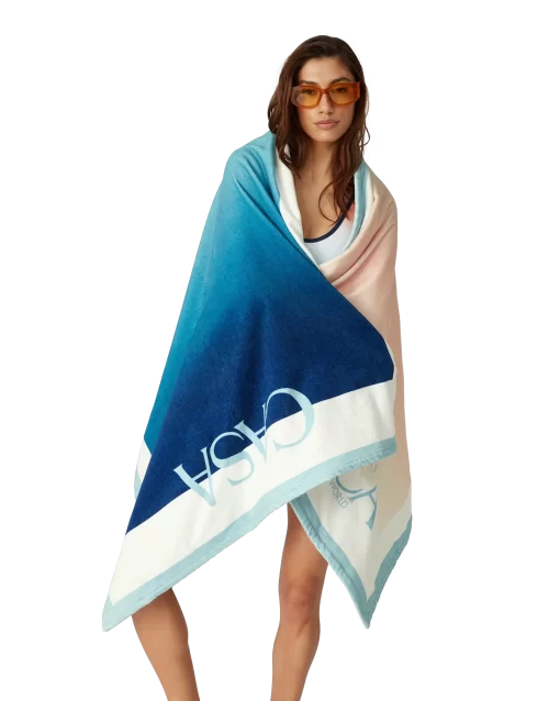 The gradient beach towel is a printed design crafted from a cotton towelling fabric. Completed with the house’s stacked logo and a light blue border.