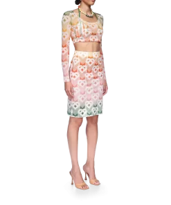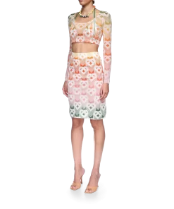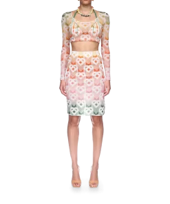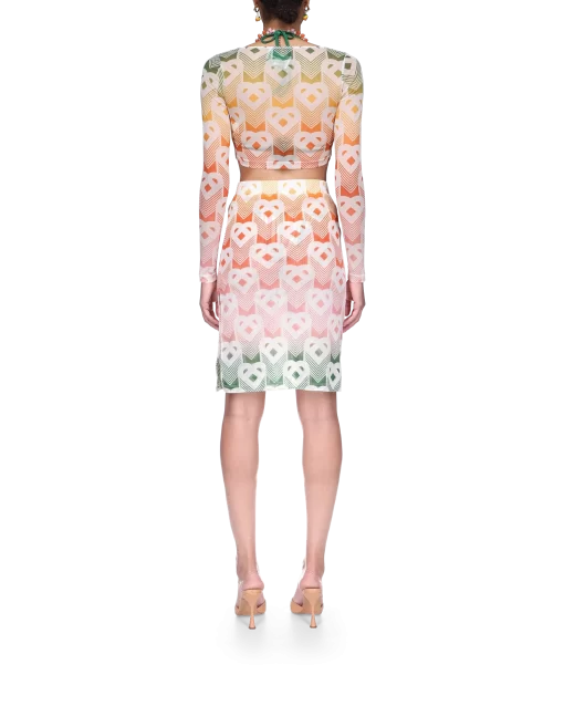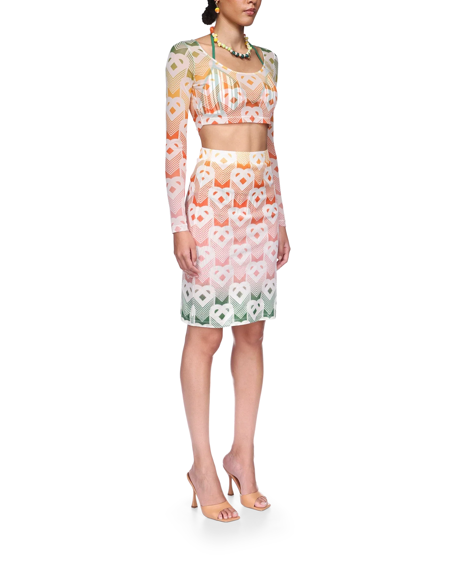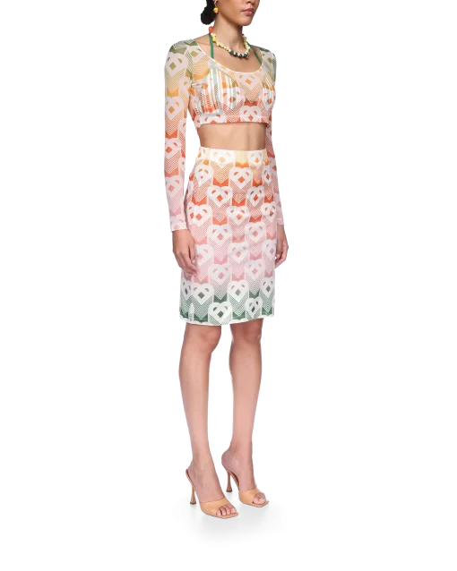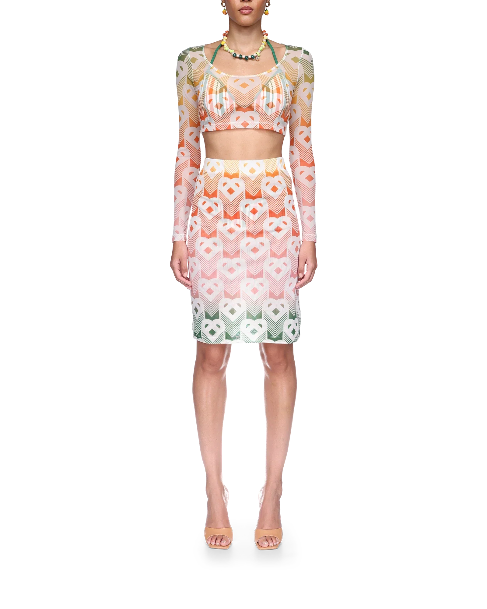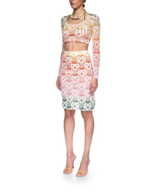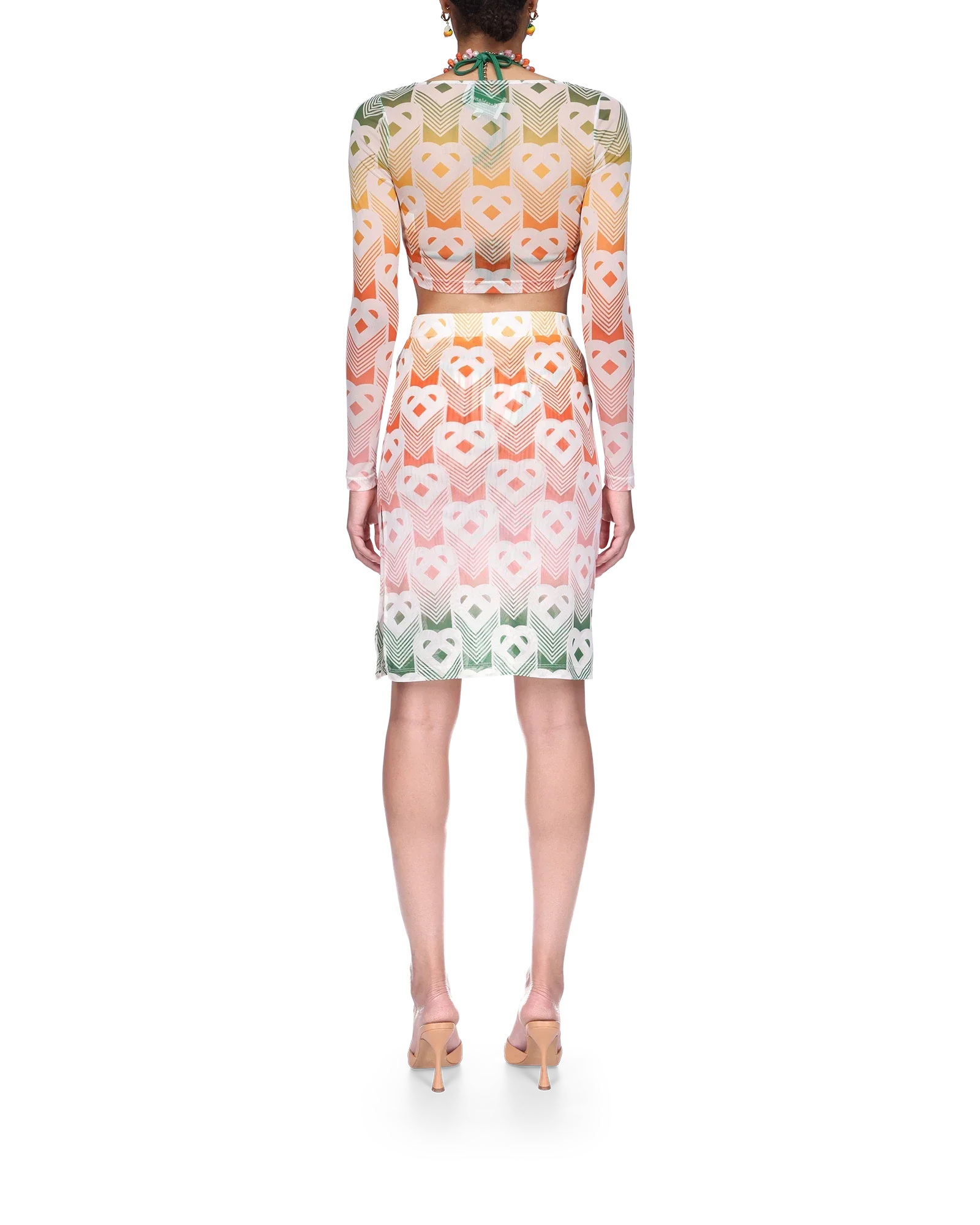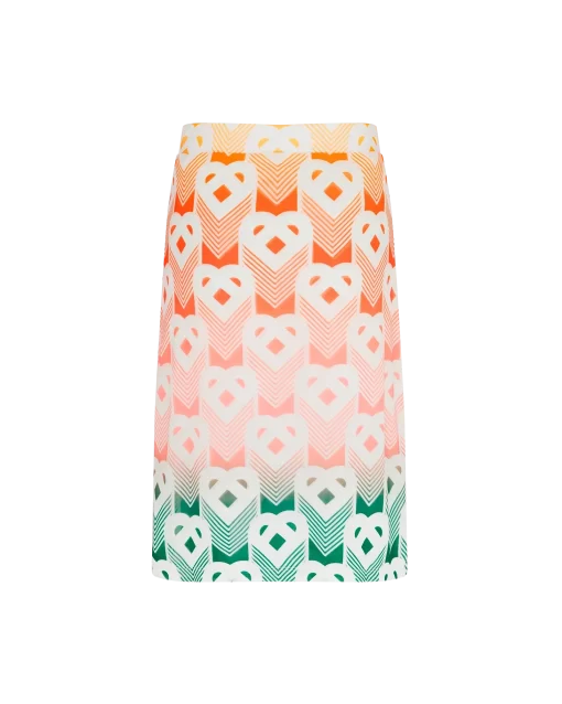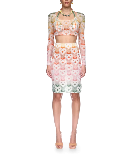 The Gradient Heart Monogram mesh skirt is a mid-length style crafted from a printed poly-blend mesh fabric featuring the season’s colours representative of the rich exchanges across cultural disciplines in African art, music and film. Completed with an elasticated waistband and side slits.