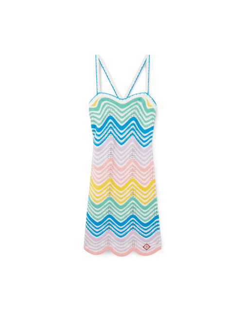 The Gradient Wave crochet dress is a cross-back mini style crafted from a crochet cotton fabric, featuring the house’s wave pattern inspired by the Memphis movement serving as a foundational design element. The colour palette for this collection is light and idealistic, emphasising ethereal themes core to our brand. Completed with the house’s signature diamond logo, and string fastening at the back.