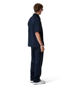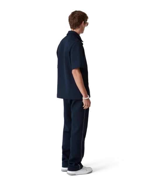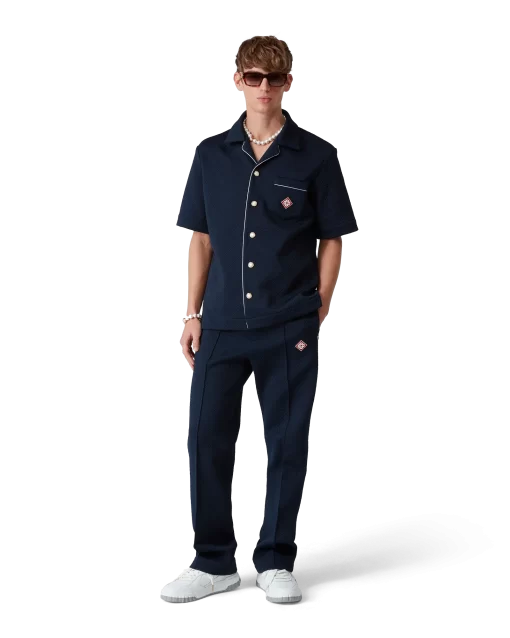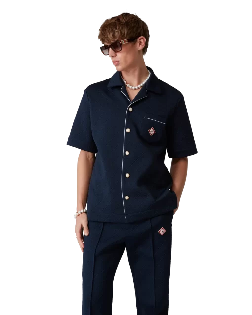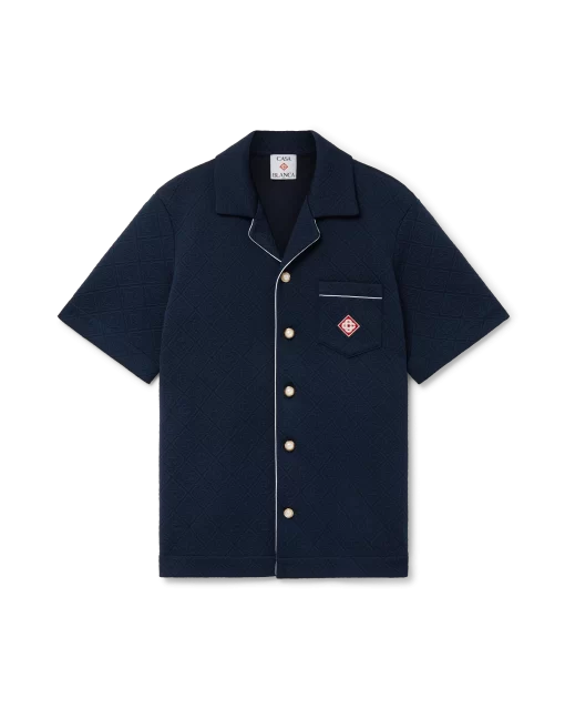 The jacquard monogram shirt is a short-sleeved design crafted from a monogram poly blend fabric. Completed with an open collar, front button closure, signature gold rim pearl buttons, a breast pocket, contrasting piping detail on the placket and pocket, and a signature diamond logo.