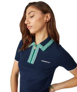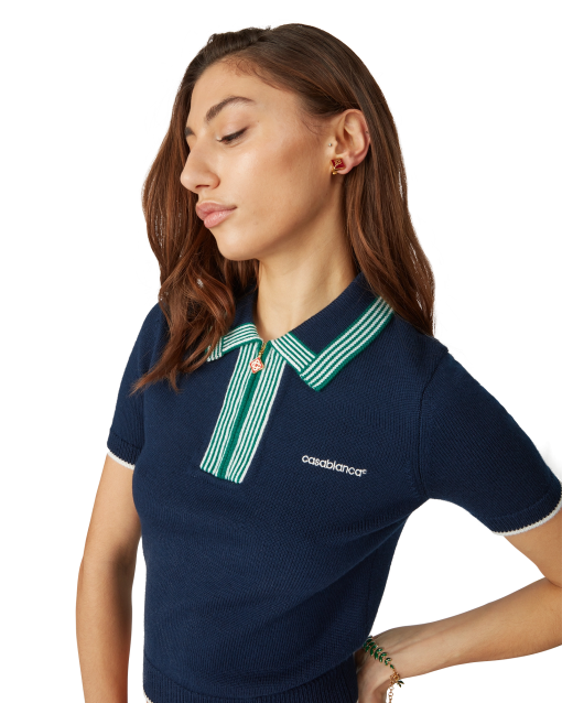 The knit tennis polo shirt is a classic design crafted from a merino wool fabric. Completed with contrast ribbed edge detail on the cuffs, hem, collar and placket, front zip closure, a rib collar and Casablanca logo.