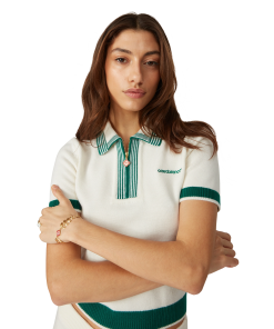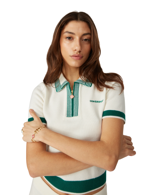 The knit tennis polo shirt is a classic design crafted from a merino wool fabric. Completed with contrast ribbed edge detail on the cuffs, hem, collar and placket, front zip closure, a rib collar and Casablanca logo.