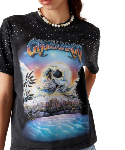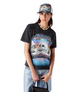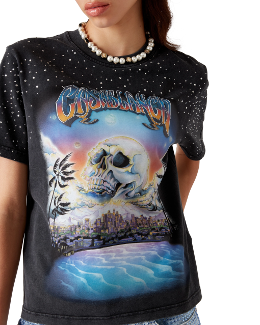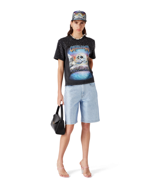 The La Prémonition crystal embellished t-shirt is a short-sleeve design crafted from a printed organic cotton fabric featuring the season’s artwork, inspired by an eerie vision of the skyline of LA at night, with UFO elements touching on vintage sci-fi inspiration. Completed with a classic crew neck.