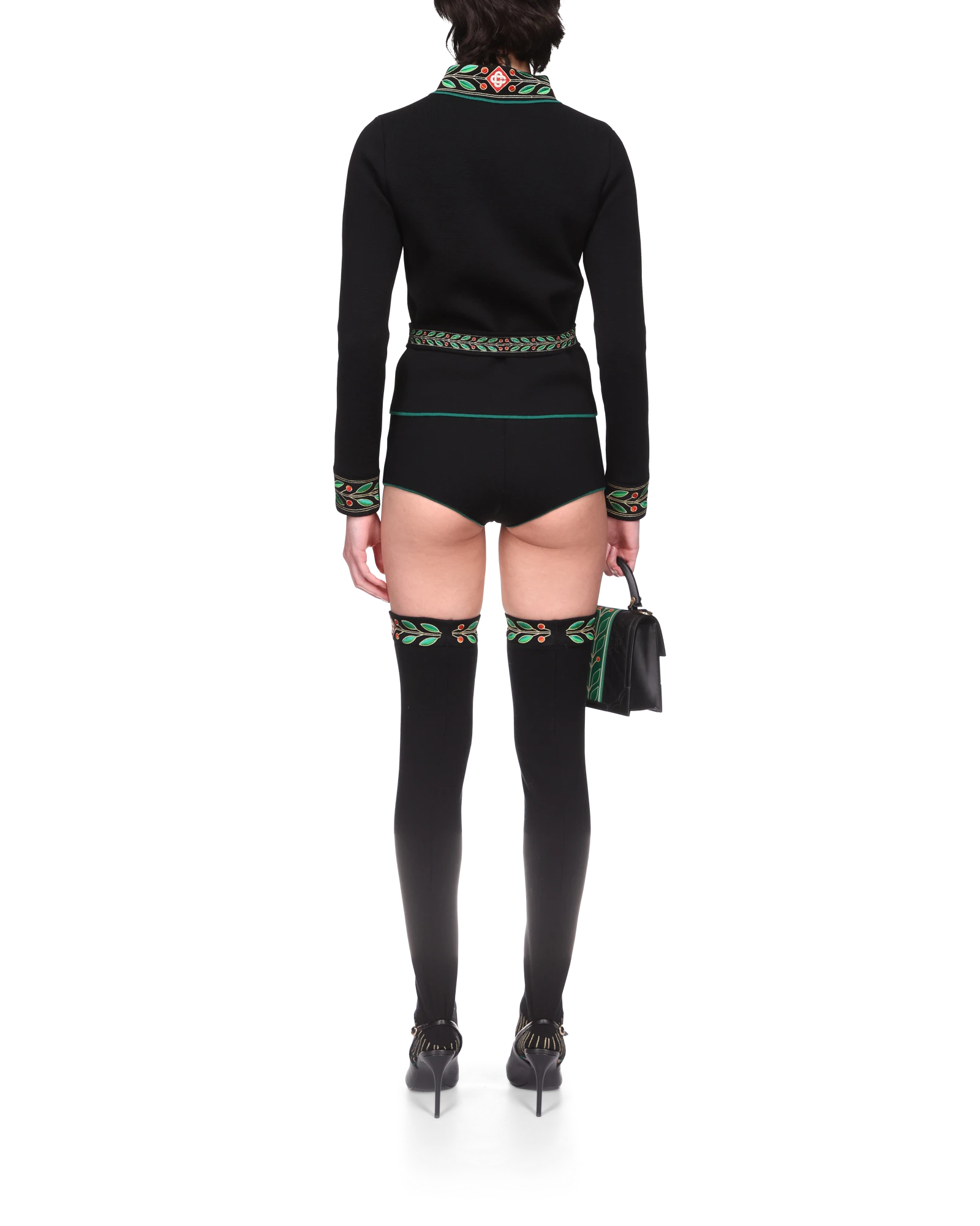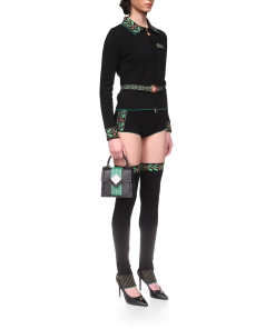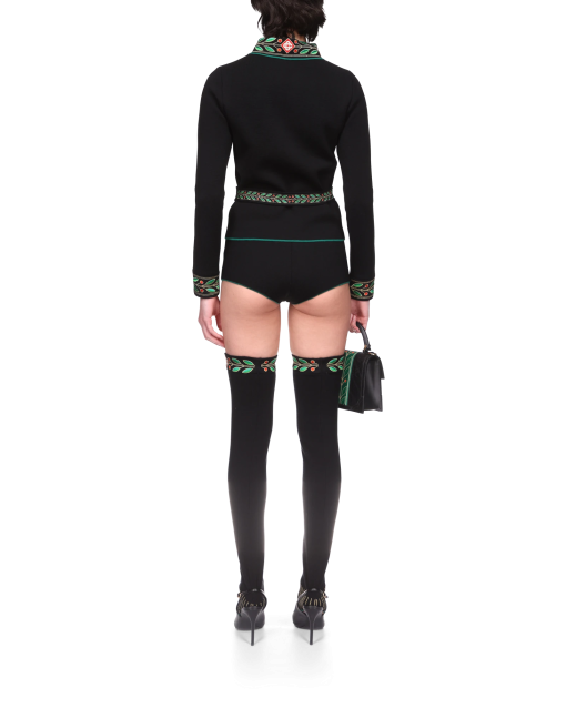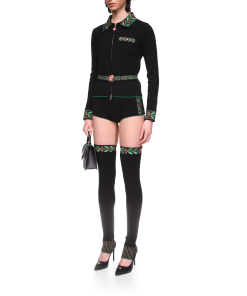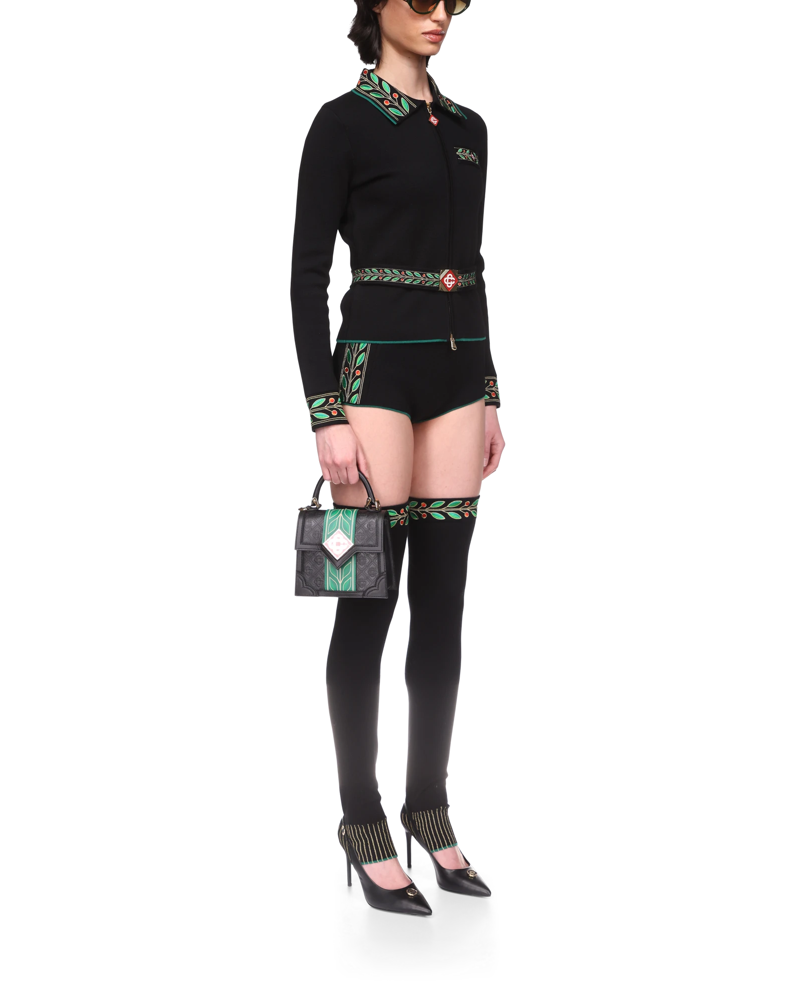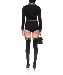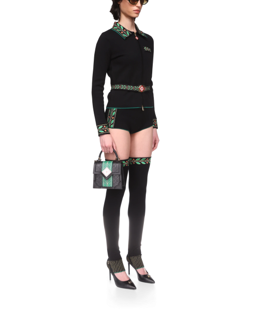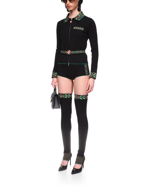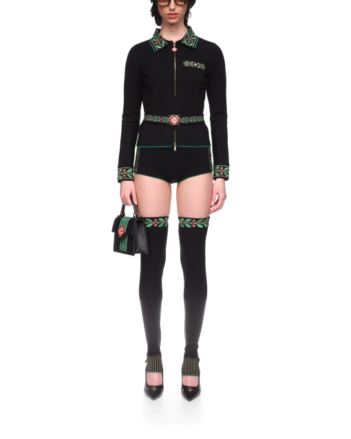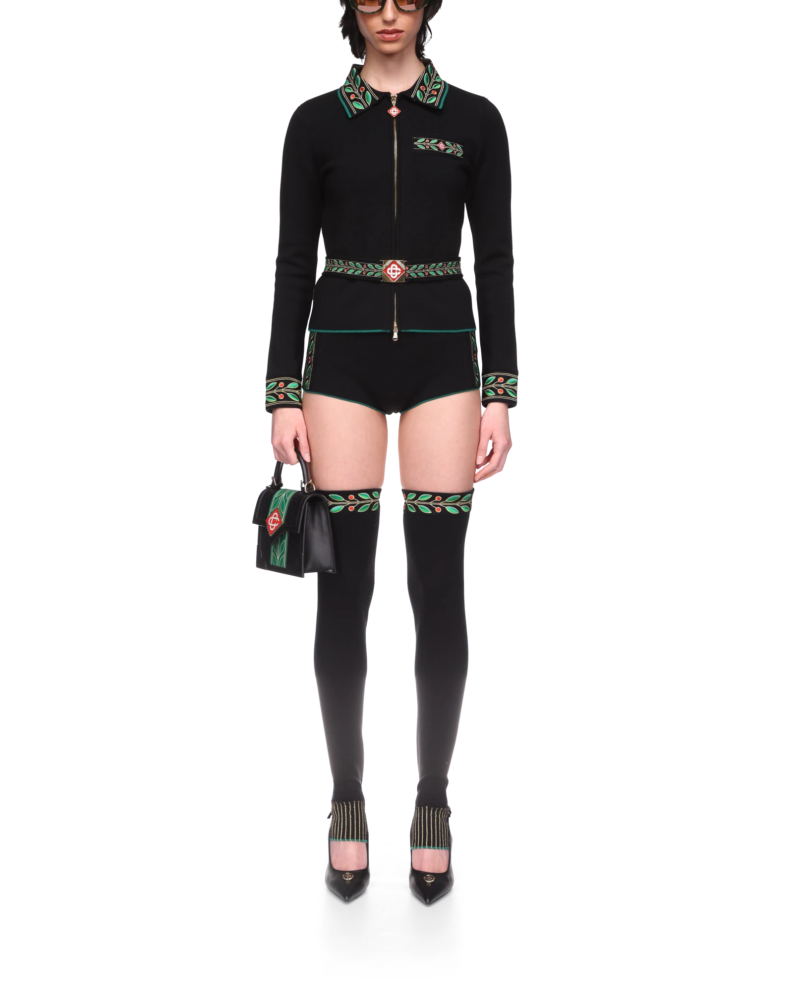 The Laurel knit jacket is a long-sleeve design crafted from knitted merino wool fabric. Completed with zip closure featuring the house’s signature diamond logo, and Laurel artwork on the cuffs, collar, breast pocket, and waistband.