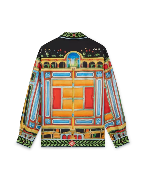 The Le Palais en Fleur silk shirt is a long-sleeved all-over printed design featuring seasonal artwork inspired by Pompeii’s architectural history, its vibrant colours, and symmetry, crafted from a silk twill fabric. Completed with the house’s signature gold-rim pearl buttons, button closure, a Cuban collar, and signature Laurel leaf artwork on the cuffs, hem, collar and placket.