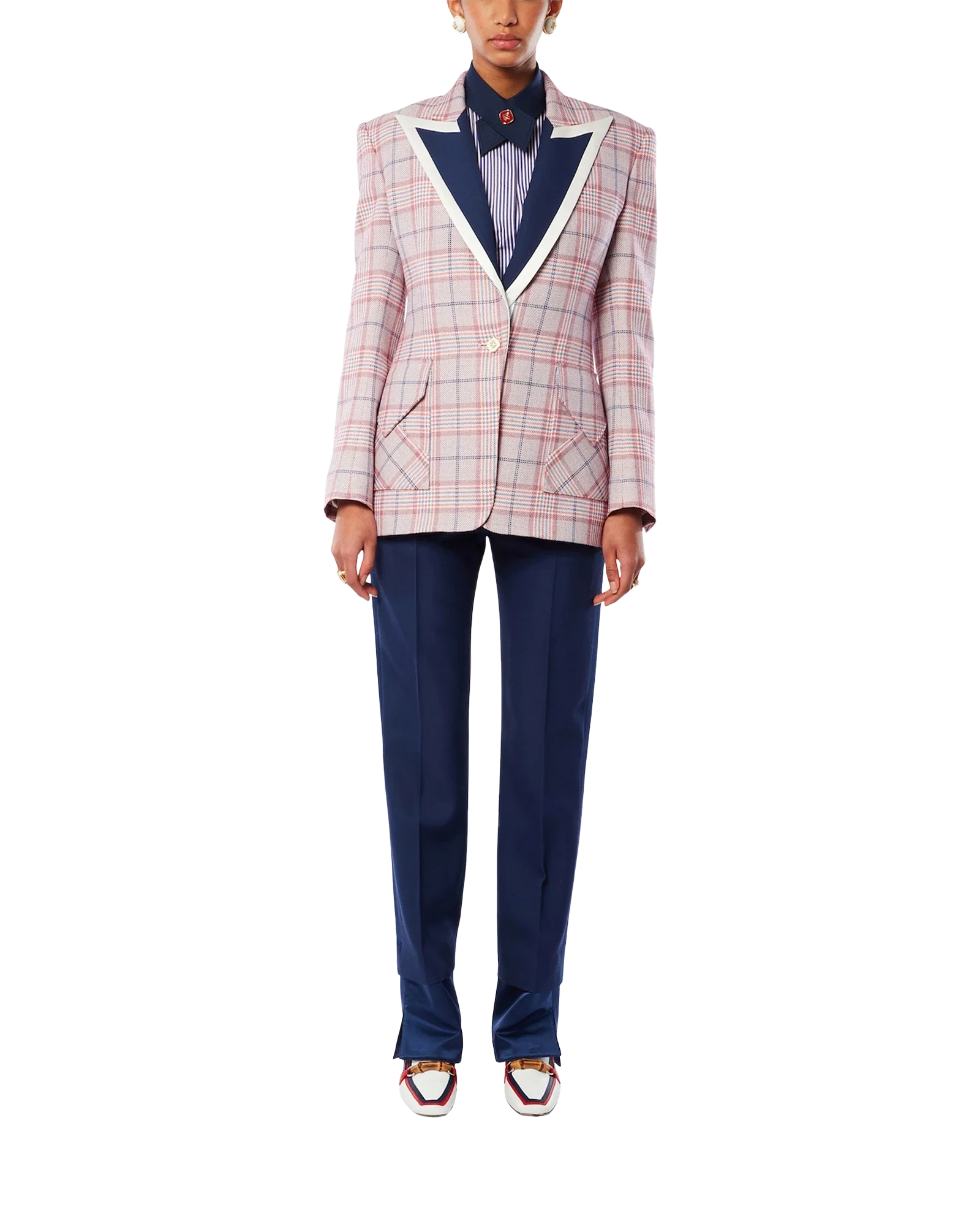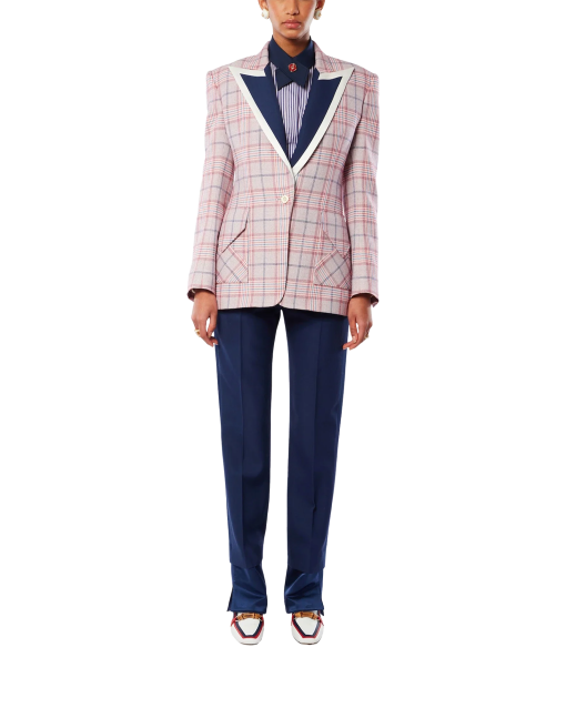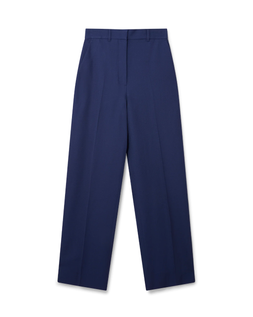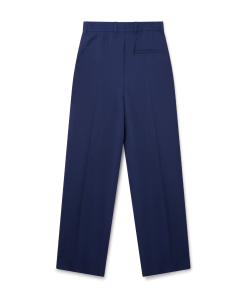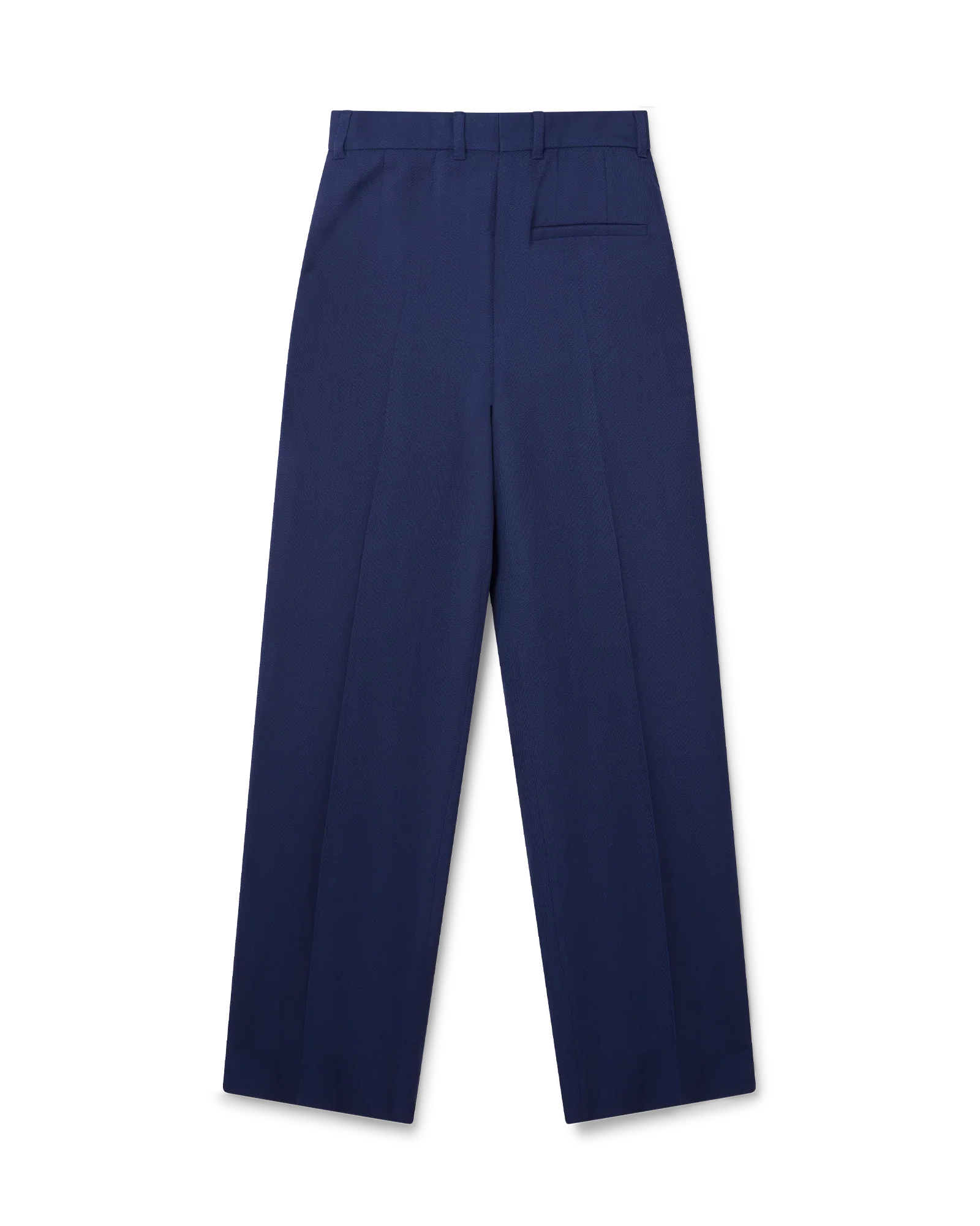 The navy wide-leg trouser is a classic tailored design, crafted from 100% virgin wool. Completed with slanted pockets, a back pocket, belt loops, cotton blend lining and a Casablanca Paris label.