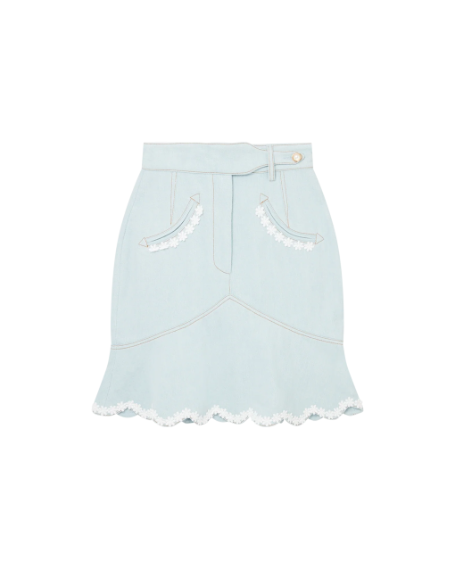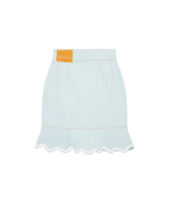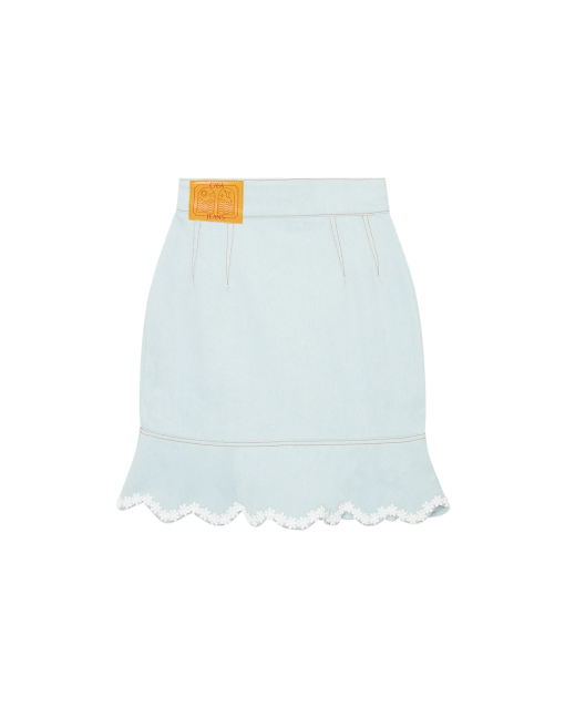 The scalloped hem mini denim skirt features white cotton broderie anglaise trims across its hem and pockets. Here, the scalloped hem is inspired by the arch symbol as seen across the collection. Finished with the house’s signature gold pearl buttons, buckles and side pockets – worn high on the waist.
