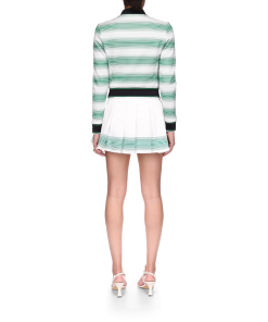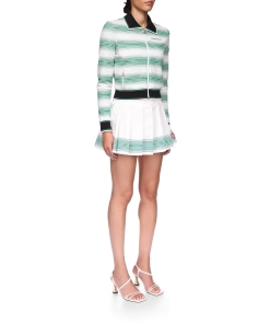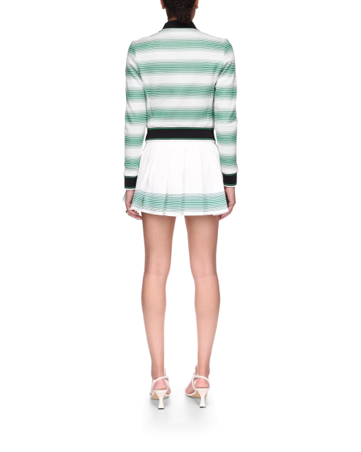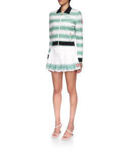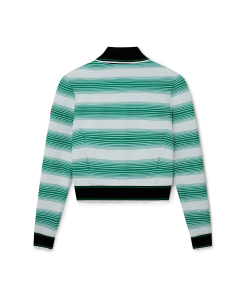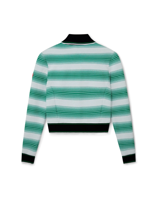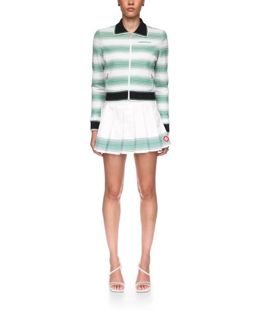 The striped track jacket is a long-sleeve sportswear design crafted from a poly-cotton fabric inspired by the Nigerian flag, featuring a gradient stripe and the Casablanca branded logo. Completed with front zip closure and vertical side pockets with the house’s signature diamond logo on zippers, a diamond logo patch on the left sleeve, and contrast rib collar, cuffs and hem with striped edge detail.