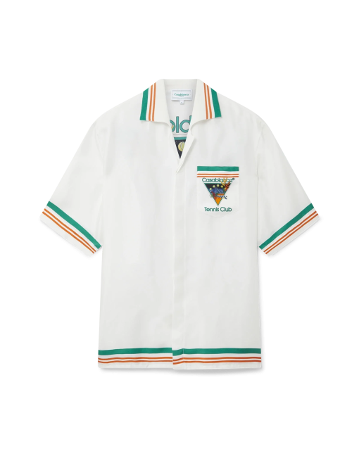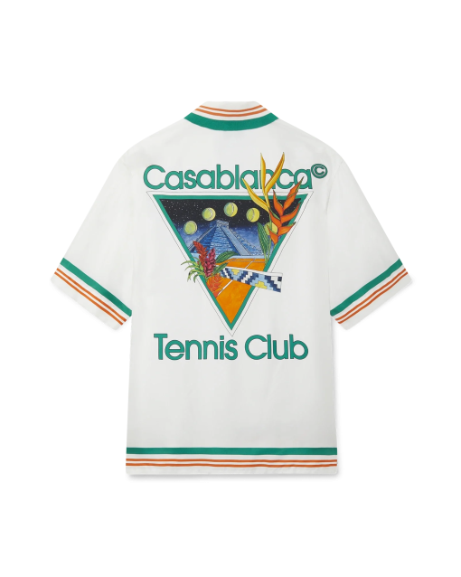 The Tennis Club Icon knitted collar white silk shirt features the house’s signature artwork reinterpreted for this season. Finished with a collar intended to be worn open, a Casablanca Paris branded label, front button closure and signature gold rim pearl buttons, it has been designed for a relaxed fit.