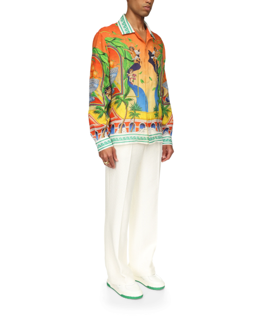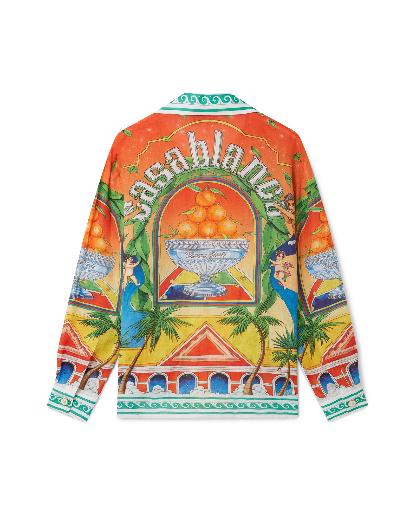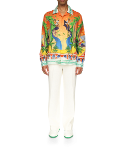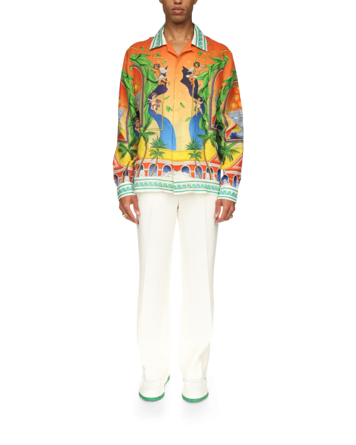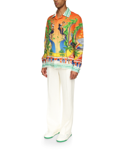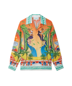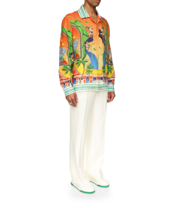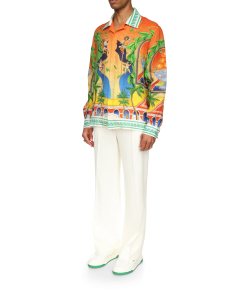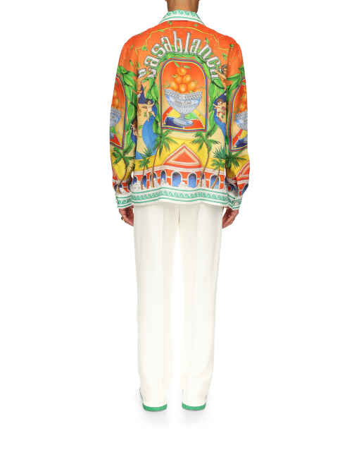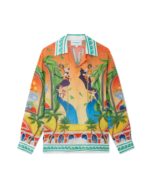 The Trophy Orange linen shirt is a long-sleeve all-over screen-printed design featuring the house’s symbology with nature and architecture. Crafted from 100% linen, this shirt is finished with enamel rim pearl buttons, wave detailing on the collar, cuffs and hem, button closure and Casablanca branded label.