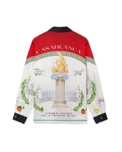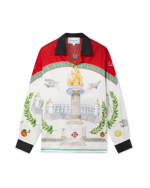 The Unique Games cotton shirt is a long-sleeved all-over printed design crafted from a cotton fabric featuring the house’s seasonal artwork inspired by ancient Greece. Completed with the house’s signature gold-rim enamel buttons, button closure, a Cuban collar, contrast collar and cuffs, and stripe detail on the hem, with Greek wave detail across the chest and back.
