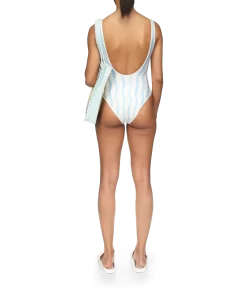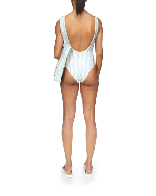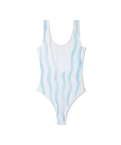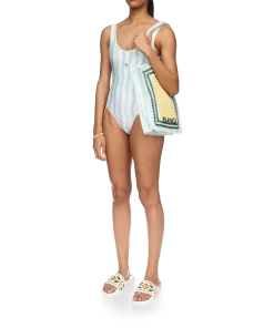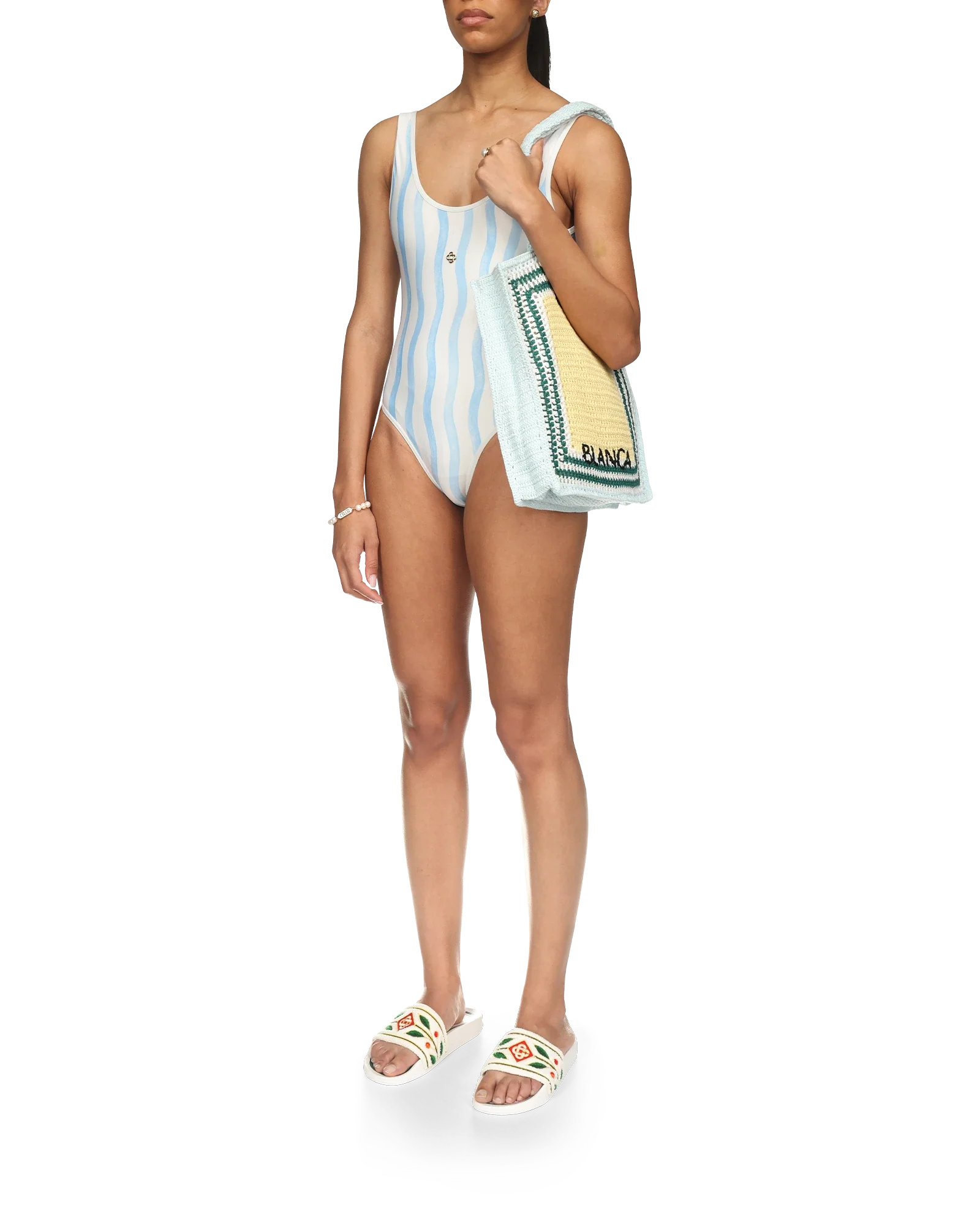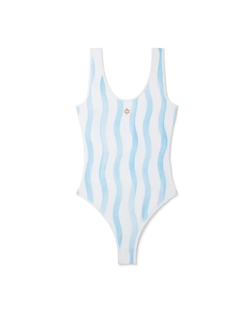 The Wave swimsuit has a classic silhouette with high-cut legs, a scoop neck, a low-cut back, and blue and white wavy stripes, inspired by the Memphis wave movement of the 1980s. Crafted from a poly-blend fabric, this piece features the house’s signature interlocking CC rivet on the chest, completed with white trims, and a Casablanca branded label.