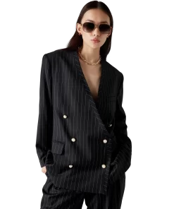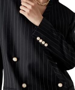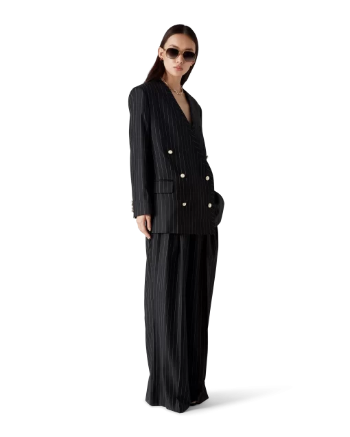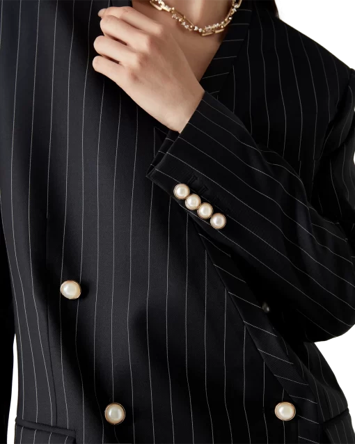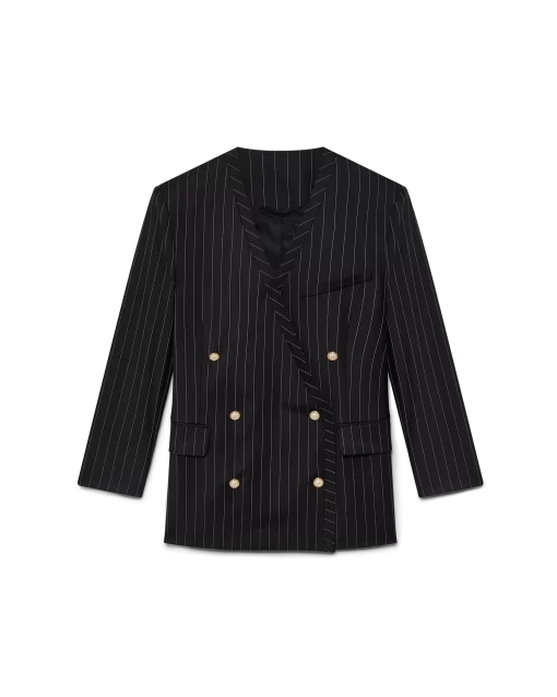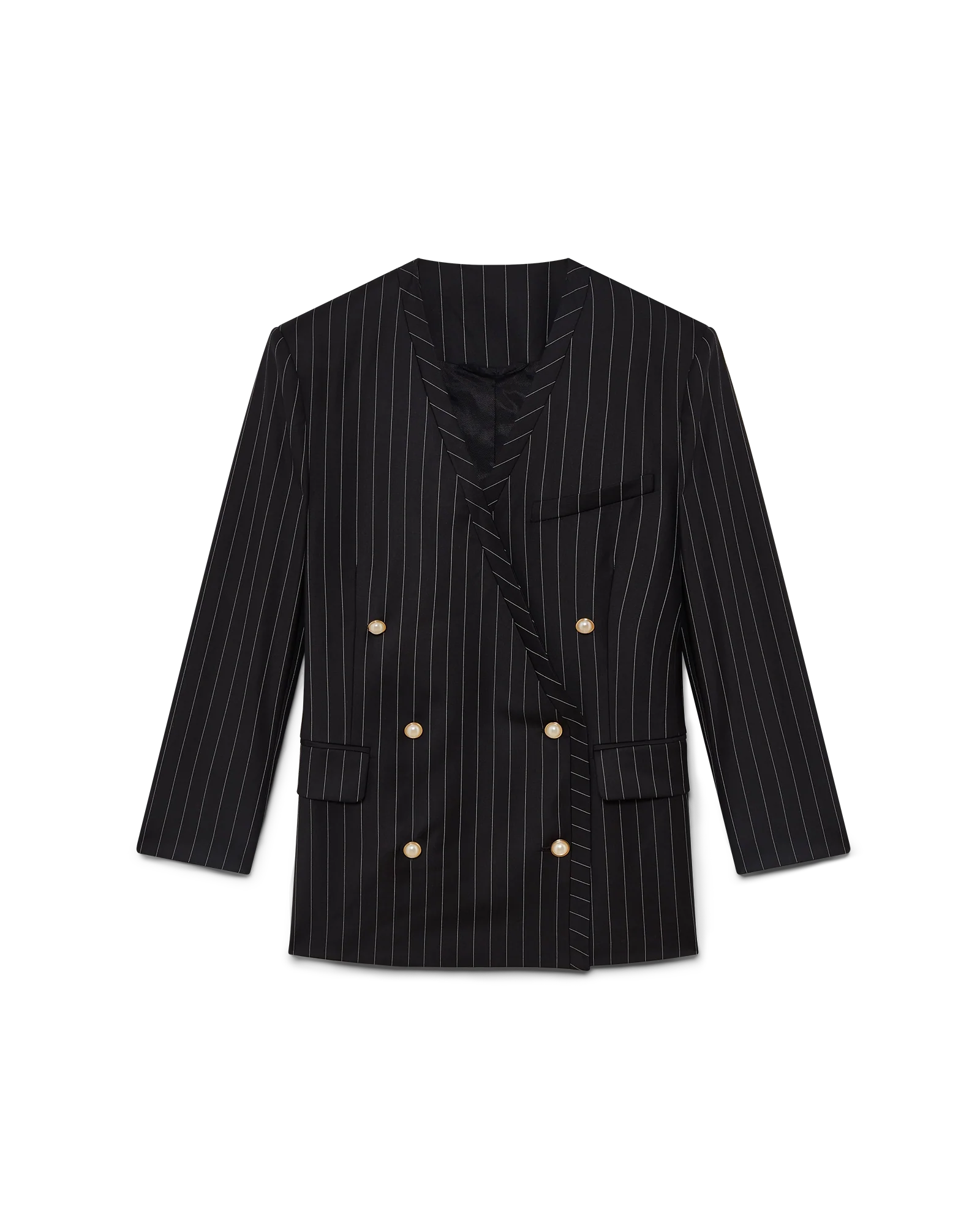 The Wool Pinstripe oversized blazer is a collar-less double-breasted design crafted from virgin wool fabric. Completed with button closure, gold rim pearl buttons, front flap pockets and a back vent.